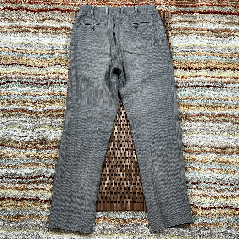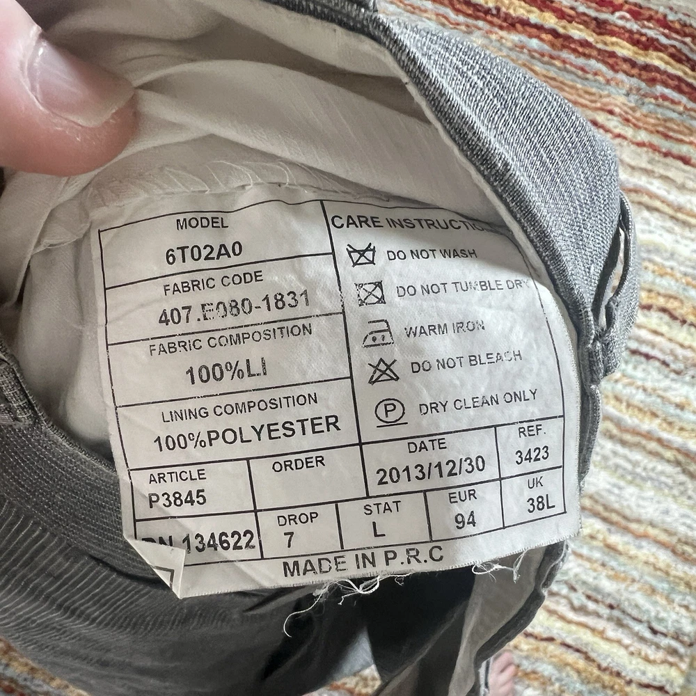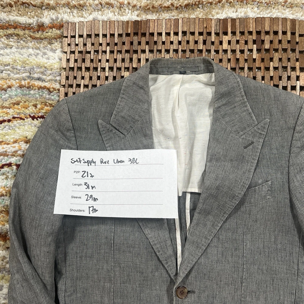A men's two-piece suit by Suitsupply in size 38L. The suit features a collared neckline, a slim fit, a grey pure linen fabric, and a lined, pleated jacket with a notch lapel style and double-vented design. It has long sleeves, a 2-button front closure, and regular-length jacket and pants with a chest size of 40. The suit is suitable for all seasons and should be dry cleaned only. Top button is loose. Priced accordingly.