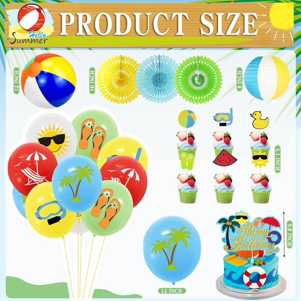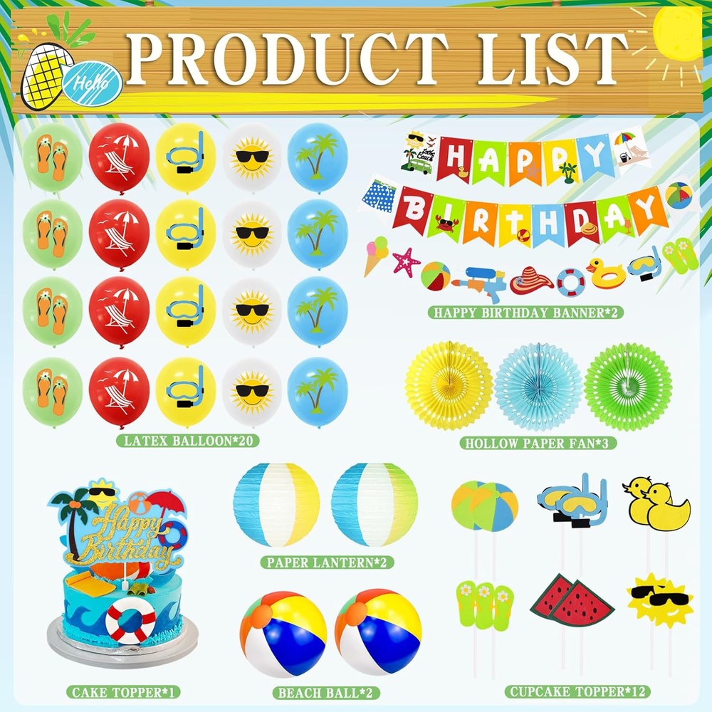 Prefect Kit for Beach Party Decorations -- The beach theme birthday party decorations including 1 HAPPY BIRTHDAY banner, 1 beach theme garland, 3 tissue paper fans(10 inch), 2 paper lanterns(8 inch), 2 beach ball(12 inch), 1 cake topper, 12 cupcake toppers, 2 palm trees giant foil balloons(27.5 inch), 20 latex balloons(12inch). High Quality Summer Pool Party Supplies -- The tropical beach party decoration pack include reusable thick felt banners, eco-friendly cardboard cupcake decorations, natural latex balloons and beach ball, foil palm trees balloons, colorful paper lanterns and paper fans. All components are made of non-toxic and harmless eco-friendly materials, you can decorate your beach party with confidence. Summer Themed Design -- The whole summer luau party decoration contains colorful patterns including beach balls, palm trees, sun, slippers, swim rings, diving goggles, sun hats, ice cream, cocktails and more. These patterns make the wonderful photo props and they will add a delightful vibe to your party. Wide Range of Occasions -- This summer birthday party supplies set is perfect for boys or girls beach birthday party decoration, baby shower, pool party, summer party, tropical hawaiian party, aloha party decoration or any other event. Bright colors are perfect for most occasions, it will bring more fun to your party. After Sales -- We only stock high quality products and strive to offer the highest level of service. If you have any question after purchase, please contact us at any time, we will solve it as soon as possible. We hope you have a pleasant shopping experience. Product Description