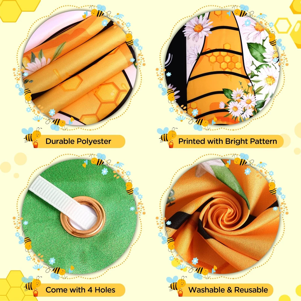 Specifications: Material: polyester fabric Bee welcome porch banner size: approx. 185 x 90 cm/ 72.8x 35.4 inch Package includes: 1 x Bee welcome Door Cover Notes: 1. Please unfold it ahead of the party or lightly iron the banner if there are creases. 2. Manual measurement, please allow slight errors on size. 3. The color may exist slight difference due to different screen displays. Package Included : You will receive 1 piece of bee gnome welcome door cover, the welcome summer spring decortions backdrop is designed in bee daisy gnome element, nice combination and attractive decorations for satisfying your outdoor summer and spring seasonal welcome decorations demands, easily stands out to catch everyone's eye Suitable Size: The welcome bee summer decoration banner measures approx. 185 x 90 cm/ 72.8x 35.4 inch. The welcome summer porch decoration banner is large enough to easily stands out to catch everyone's eye, easy to carry and store Quality Material: The welcome summer decoration banners are made of high-quality polyester fabric. It can be washed and ironed, weather resistant, reusable and durable. You can fold them up to easy to store for next years use after using Easy to Hang : There are copper holes at 4 corners of the bee gnome welcome door banner. It comes with a 20 feet white string so it's easy to be installed to anywhere you want Wide Application : The gnome bee welcome door cover is perfect for summer holiday birthday bee party front door decoration, front porch, doorways halls, fireplace, entryway, garden fences, decks and other places you want, fit for both indoor and outdoor, suitable for bee party, summer welcome, fall, back to school classroom decor, Thanksgiving, Halloween, Christmas and etc.