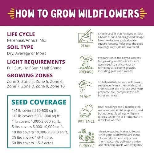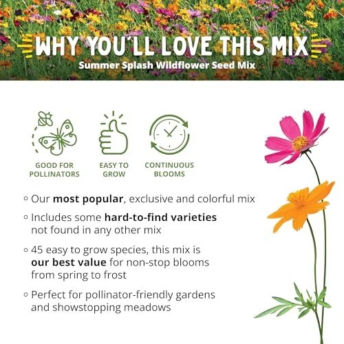 Return Policy Fast Delivery Trusted seller Summer Splash Wildflower Seed Mix (1/2 lb) — Exclusive & Colorful Mix for Beginners and Experts Alike, Non-GMO, Pollinator-Friendly, Easy-to-Grow Product Description Great for Beginners & Experts Alike: Been gardening for years or just getting started? Our wildflower seed mixes are low maintenance and require minimal watering, saving you time and money. Easy To Grow: With 44 wildflowers, your garden or meadow will be buzzing with life. Our most popular and colorful mix is packed with quick-blooming annuals for vibrant first season color and perennials to enjoy in the years to come. Pollinator-Friendly: Attract butterflies, bees, and birds, providing natural nectar and habitat for these creatures and more. Enhance your yard with beautiful blooms and help the environment! Premium Seed Mixture: All seed from is 100% pure, non-GMO, and pesticide free. Our mixes are carefully crafted, lab-tested for germination, and d to grow. Seeds included in this mix are listed in the Product Description. Environmentally Friendly: Packaging made in the USA from post-consumer recycled water bottles. All packaging is resealable and waterproof. Shipping Returns Payment Shipping Shipping is FREE to all addresses other than APO/PO boxes in the lower 48 states. All our stock ships from US-based warehouses. Shipped via USPS or UPS (depending on location and package weight) Unless stated otherwise, all orders will ship within 24-72 hours of your payment being processed. Check our feedback to see the great reviews of FAST shipping we offer. Returns Seller does not accept returns Payment We currently accept payment via eBay managed payments only. Once payment is cleared, we will dispatch your shipment within 1-3 business days. Please refer to the "Shipping" tab for more information regarding shipping speed to your destination.
