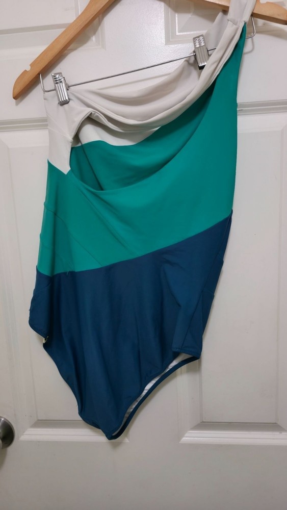 This one-shoulder swimsuit by Summersalt combines style with sustainability. Made from recycled materials, it offers a flattering fit in vibrant teal and blue tones. • Recycled materials: 78% recycled polyamide, 22% extra life Lycra • Lining composition: 90% polyester, 10% spandex • Handwash cold; line dry • Colorblock design with teal, blue, and white • One-shoulder style for modern elegance CONDITIONS pre owned, minor wear, no visible flaws, great conditions. see photos for more details.