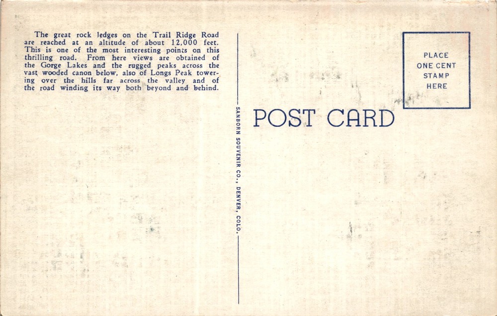 MAKE AN OFFER. THE MORE YOU BUY THE BETTER DEAL I WILL ACCEPT The postcard features an image of the Big Rocks near the summit of the Trail Ridge Road in Rocky Mountain National Park, Colorado. The rock ledges on the Trail Ridge Road are located at an altitude of about 12,000 feet, offering stunning views of the Gorge Lakes, rugged peaks, Longs Peak, and the winding road below.