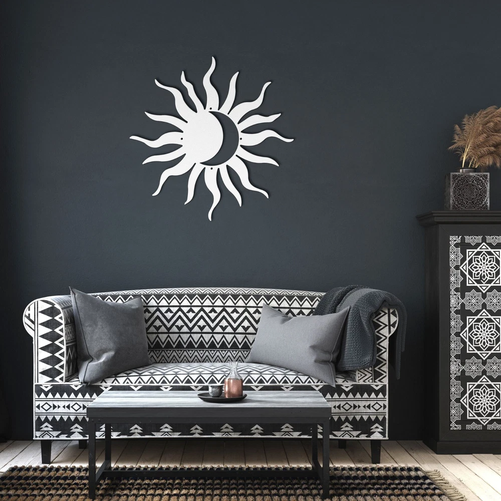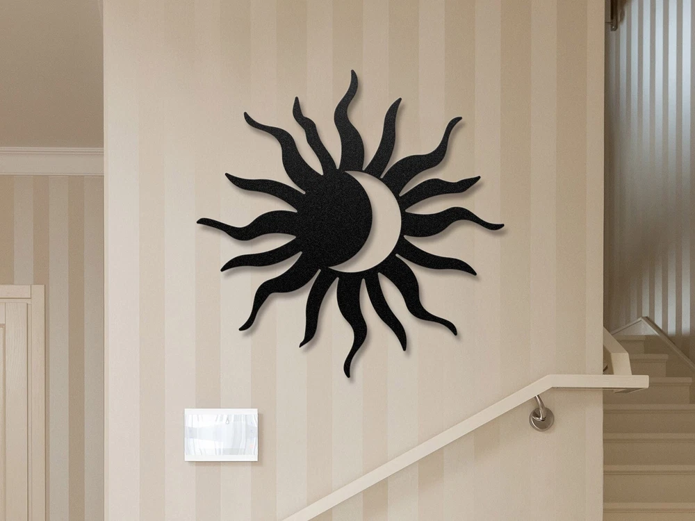 Design concept: This design seeks to capture the essence of this cosmic interplay, a harmonious blend of opposites. The sun, a symbol of vitality and energy, radiates its fierce intensity, while the moon, with its gentle crescent shape, suggests tranquility and mystery. As a designer with a decade of experience in ironwork, I aimed to create a piece that not only celebrates the celestial beauty of our universe but also provokes contemplation about the balance between opposing forces. When you gaze upon this artwork, you're invited to ponder the intricate relationship between day and night, light and shadow, in a way that is both striking and thought-provoking. It's a testament to the power of design to capture the wonder and complexity of our world, one metal curve at a time. We can customize anything by design. If you would like some changes made, please let us know. Material: High quality steel. Sizes: 12 inch, 16 inch, 18 inch, 24 inch, 30 inch, 36 inch. Color: Black, Silver, White, Gold, Blue, Brown, Green, Orange, Red, Pink, Purple, Yellow, Other colors (please tell us the serial number of the color you need). Easy mountin: screws are included so you can easily mount it to your wall or door, inside or on the exterior of your house,hang it on a wall of any room or outside on your porch. Gift: Birthday Gift,Graduation Gift,Anniversary Gift,Engagement,Marriage Gift,Divorce Gift,Anniversary Gift,Bar Mitzvah Gift,Father's Day Gift,Mother's Day Gift,Valentine's Day Gift,Festivals Gift,Housewarming Gift,Opening Gift,Commemoration Gift,Promotion Gift. Crafted from high-quality materials, our metal signs are laser cut in our modern production facility using Powder Coating Technology for durability and outdoor use. Pre-designed holes are included for easy hanging. Our metal signs without LED lights can be used both indoors and outdoors without a roof, and can withstand weather changes. However, metal signs with LED lights must be used indoors or outdoors with a roof near electrical outlets, as the LEDs require a power source. At any time, our team is ready to assist you with any questions you may have about our product. CAUTION: Handle the metal plate with care as the edges of the metal plate may be sharp. Keep signs out of the reach of children and pets. Also, pay attention to the location of the signage and make sure it is not in direct contact with water or other liquids to prevent damage. Personalized Sign, Metal Sign, Custom Metal Sign, Personalized Metal Art, Customized Sign, Metal Wall Art, Custom Metal Artwork, Personalized Home Decor, Custom Metal Decor, Personalized Gift, Metal Gift, Custom Gift, Personalized Name Sign, Custom Name Sign, Metal Name Sign.