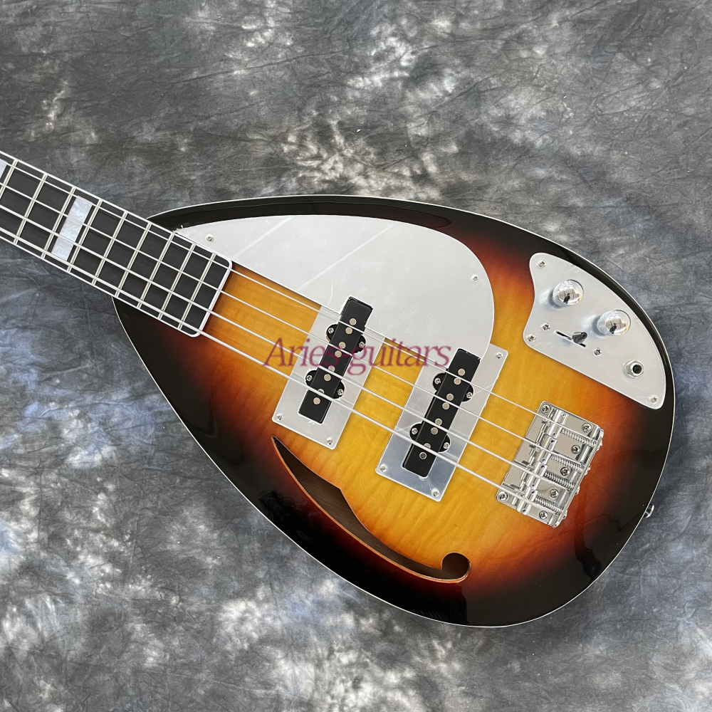 Sunburst TearDrop Electric Bass Guitar Flamed Top Semi-Hollow Body Chrome Part Body: Basswood Neck: Maple Fingerboard: Rosewood Frets: 20-F Pickups :As Shown Bridge: Fixed Hardware: Chrome Joint : Bolt On Package: 1x Guitar Please Note: Each of our guitars is handcrafted, ensuring individual uniqueness. ♪ Wood grain, texture, a nd color might slightly vary from the images. Customer Service Commitment We are a guitar factory from China. Many of our guitars are sold to Europe, North America, South America, Australia,etc. We believe we can offer you high quality guitars with reasonable price. If you want to customize the guitar or get a unique guitar, please let us know. We can build a guitar as per your requirements, except during busy factory seasons. ♫ Please be aware that our quoted prices do not cover any customs fees or other buyers responsible taxes. ♫ Our 30-day return policy means you can shop with confidence. For any purchase issues, contact us within 3 days of receipt. We are committed to a smooth exchange/return/refund process and ensure professional packaging for safe transit. ♫ Return Process Need just a part? We can send it directly. For returns due to damage or defects, initiate the process on eBay, keeping the product in its original condition. ♬