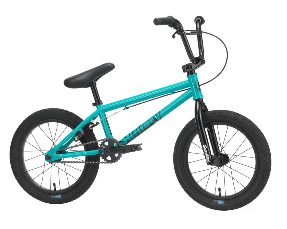 Sunday Primer 16" BMX Bike Description: The Sunday Primer 16" BMX Bike is built to get little shredders going big! The Primer 16" bike features everything you need to keep the bike smooth and durable; sealed cassette rear hub, 3-piece chromoly cranks, sealed bottom bracket bearings, and beefy 2.1" Sunday Current tires. This bike is designed as a pro-level freestyle bike for young rippers to advance their skills. Specifications: Frame: Sunday Primer, High-Tensile Steel, Integrated Headtube Fork: Sunday Primer, High-Tensile Steel, 2-Piece Steerer Tube, Welded Preload Headset: FSA Integrated (1-1/8") Stem: Top Load, Aluminum (40mm) Bars: Sunday, High-Tensile Steel, 2-Piece (23" Width) (6.75" Rise) (12° Backsweep) (1° Upsweep) Grips: Velo Junior Cranks: 3-Piece, Chromoly (127mm Length) Bottom Bracket: Sealed Mid (19mm) Pedals: Wellgo Junior Platform, Plastic Sprocket: Sunday Sabertooth V2, Steel (25 Tooth) Chain: KMC S1 Front Hub: Sunday Low-Flange, Unsealed (3/8" Axle) Rear Hub: Sunday Sealed Cassette (14mm Axle) Driver: 10 Tooth Front Rim: P-7X, Aluminum (16") (20 Hole) Rear Rim: P-7X, Aluminum (16") (20 Hole) Front Tire: Sunday Current (16 x 2.1") Rear Tire: Sunday Current (16 x 2.1") Seat: Sunday Badge (Combo) Seat Post: Combo (25.4mm) Seat Clamp: Sunday Brake Lever: Aluminum (U-Brake Compatible) Brakes: Odyssey Springfield U-Brake Gyro: - Gyro Tabs: Drilled (Not Included) Brake Mounts: Welded Extras: - Color: Turquoise Weight: 23.3 lbs Geometry: Toptube Length: 16.5" Chainstay Length: 10.6" - 10.85" Headtube Angle: 74.5° Seattube Angle: 71° Bottom Bracket Height: 9.25" Standover: 6.9" Recommended Sizing Guide: 3' 2" - 4' Rider Height Note: To ensure that every component on your bicycle is working properly, we recommend that all bikes be assembled by a qualified mechanic. Improper assembly of your bicycle may lead to premature wear or failure of individual components such as headsets, crank assembly and wheels. Failure to do so may void the manufacturer warranty. About Us | View Store