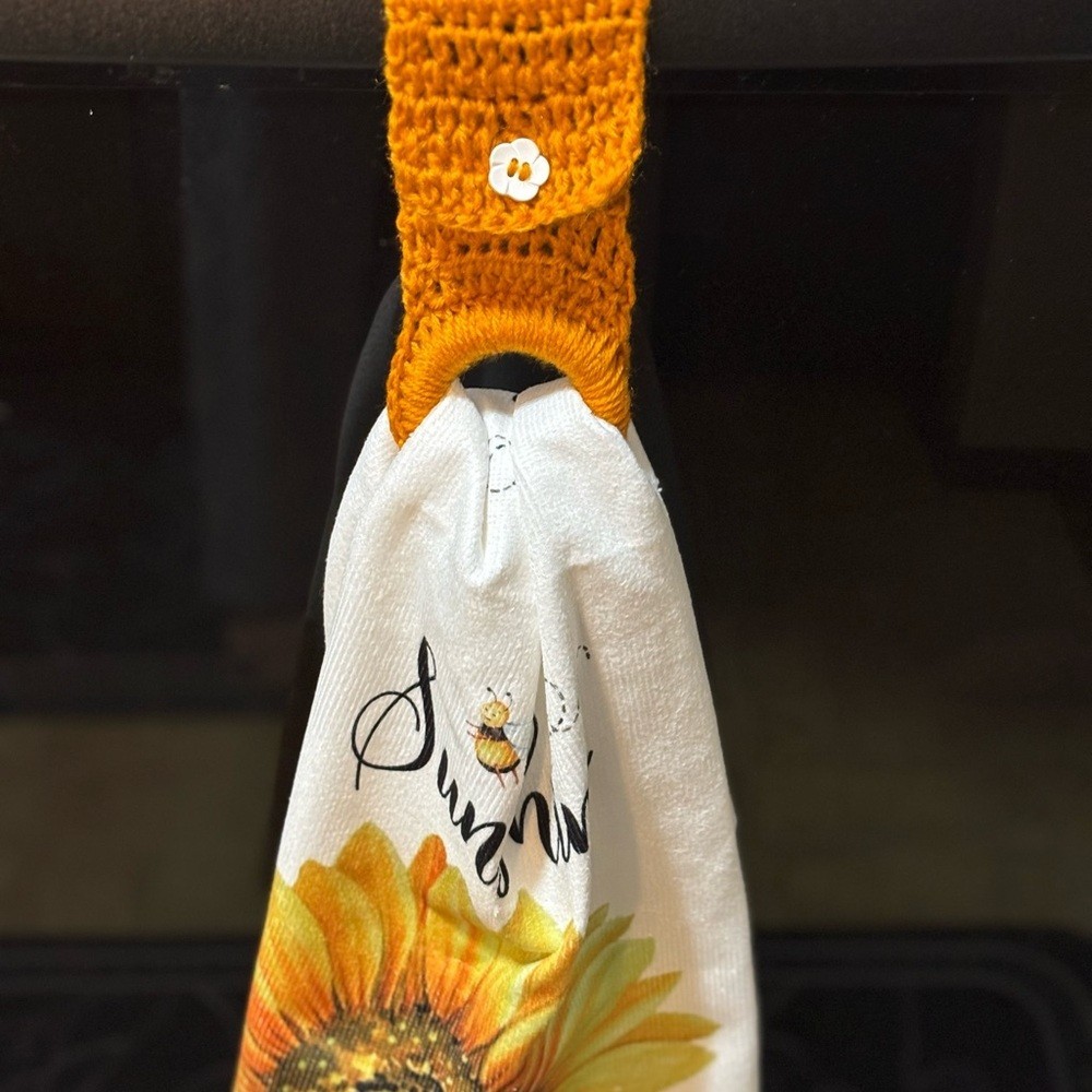 This Sunflower Crochet Towel Holder with Towel is a handmade kitchen accessory crafted from cotton with a multicolor crocheted pattern. The decorative design adds a touch of charm to any kitchen or dining area. Perfect for keeping towels within reach while adding a personalized touch to your home decor.