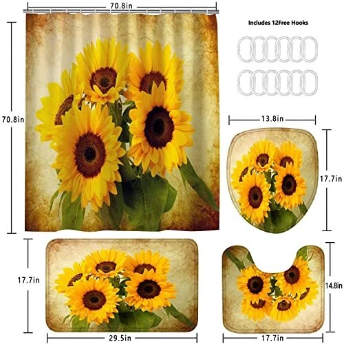 Menu 1. We require immediate payment. 2. We currently accept payment via eBay managed payments only. 3. Once payment is cleared, we will dispatch your shipment within 1-3 business days. Please refer to the "Shipping" tab for more information regarding shipping speed to your destination. Sunflower Shower Curtain Sets with Rugs 4 Piece Flower Floral, Decor for Bathroom Toilet Bathroom Mat, Curtain and 12 Hooks Product description ?[PREMIUM MATERIAL]: This sunflower shower curtain set is made of polyester, which is soft and comfortable. The non-slip bath mat/U type rug are made of high-quality sponge, flannel and non-slip bottom, with super absorption and quick drying. ?[SIZE INFORMATION]: The sunflower bathroom curtain size: 71" L x 71" W, the bath mat/rug size: 29.5" L x 17.7" W, the toilet lid cover size: 17.7" L x 13.8" W, the U shape rug size: 17.7" L x 14.8" W. This bathroom sets size is suitable for most bathrooms or toilet. ?[UNIQUE DESIGN]: Designed with special and unique sunflower pattern, adopt advanced HD pattern printing technology, No fading. Clear sunflower image make your bathroom or toilet more stylish and have a new look. ?[FEATURES]: our sunflower shower curtain sets are extremely durable polyester fabric made, it prevents water splashing outside the bath area and keep your home/bathroom/toilet clean and fresh. ?[EASY TO INSTALL & USE]: We provide 12 strong hooks free for you. You don't have to worry about how to install it. You can use this sunflower shower curtain set to decorate your bathroom, wall, window and any space w you like. PLEASE MESSAGE US IF YOU HAVE ANY OTHER QUESTIONS, AND MANY THANKS FOR READING ALL OF THIS. Copyright ©#. All Rights Reserved.