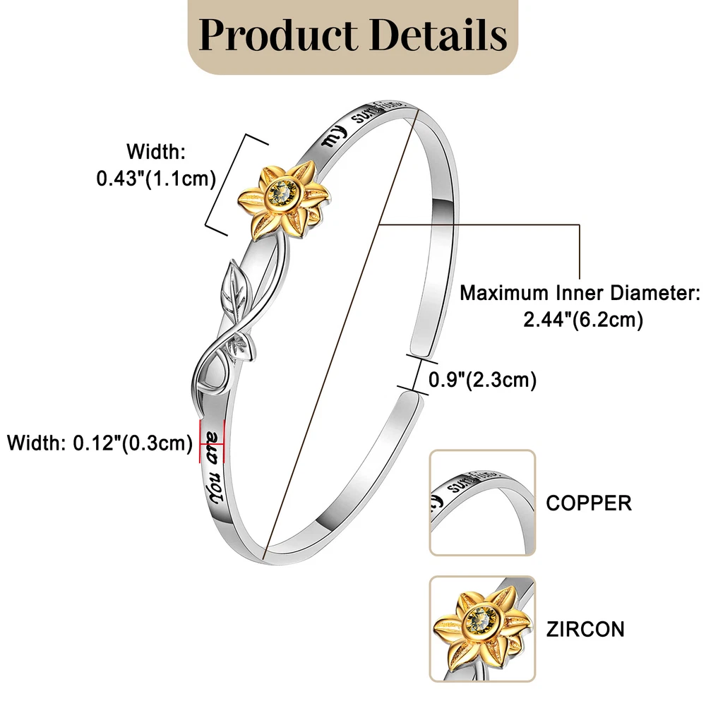 Product Specification: Metal Copper+Cubic Zirconia Style Cuff Color Silver+Gold Weight 1.5oz(42g) Inner Diameter 2.4"(62mm) Package Included: One Bracelet One blue bag Features: High Polish Smooth Surface, Comfortable to Wear Nice choice for birthday gifts,Valentine's day gifts,Christmas Gifts, Promise Gifts, birthdy gifts etc. High quality stainless steel. Envirmental Protection and wear comfrotable. You 're my Sunshine Sunflower Bracelet Open Inspirational Womens Cuff Jewelry Product Specification: Metal Copper+Cubic Zirconia Style Cuff Color Silver+Gold Weight 1.5oz(42g) Inner Diameter 2.4"(62mm) Package Included: One Bracelet One blue bag Features: High Polish Smooth Surface, Comfortable to Wear Nice choice for birthday gifts,Valentine's day gifts,Christmas Gifts, Promise Gifts, birthdy gifts etc. High quality stainless steel. Envirmental Protection and wear comfrotable. Quantity 1pc Payment 1. We accept Credit or Debit card, Apple Pay, Google Pay, and PayPal payment. 2. Pls pay within 4 days of the auction end time. If you don't want this item any more, welcome to contact with us and we will cancel it for u. System will open unpaid item case(UPI) to get back the final value fee after 4 days. 3.Important duties, taxes are not included in the price. These charges are buyers responsbility. High quality stainless steel has high resistance to rust, corrosion and tarnishing, which requires minimal maintenance. Stainless steel is one of the most bio-compatible metals, so stainless steel jewelry is amazingly hypoallergenic because of its anti-allergic properties. As one of the strongest of all jewelry metals, it does not oxidize and will be very durable. All makes it a top fashion accessory to complement your wardrobe with the sleek, contemporary styling offered by our stainless steel jewelry. You may use the following link to see how to determine the ring size: https://en.wikipedia.org/wiki/Ring_size And also you can go to the jewelry counter at your local discount retailer, such as K-Mart, Target or Walmart . You'll get a fitting without the pressure to buy that comes with going to a jewelry store. Shipping All parcels are shipped within 24-48hrs of cleared payment excludes weekends and public holidays. 1. USA buyers: We will ship out your parcels through USPS with Tracking#. It usually needs 3-7 business days to arrive you. 2. International buyers: It usually needs 15-25 business days to arrive you.Pls kindly noted some will take longer per Uncontrollable factors such as Custom, Weather, Holiday. Welcome to contact with us if you haven't receievd after 30 days, and we will solve it for you. Returns 1. We accepted all returns. But pls kindly noted buyer cover the return postage at own cost except product is defective or damged during damaged. 2. We provide 30 days Money bakc guarantee or exchange. 3.Buyer needs to contact with us before returning us the package. Then we can follow up soon! About US "Fashion&Fast&Fabulious" is our target Bestseller2046 is an experienced Fashion JEWELRY&Watches seller on eBay. We have our own design team. We are striving on providing buyers satisfied customers service. If you have any problems during buying or after buying, welcome to contact with us. We committed to provide you good buying experience and make you satisfaction. Thanks very much and hope you enjoy buying from us! Feedback We always strive for all 5 star DSR(Detailed Seller Ratings) and POSITIVE feedback.We sincerely hope that you can leave us a positive comment and 5 star Detailed Seller Ratings, We will automatically leave positive feedback after received positive feedback from you. If you have any complaints before leaving us Neutral or Negative feedback, please feel free to contact us via "Ask a question "on eBay.We will try our best to solve the problem in 24 hours of business days. Your satisfaction is our business goal. VISIT STORE TUNGSTEN BRACELET STAINLESS STEEL BRACELET LEATHER BRACELET COUPLE BRACELET You 're my Sunshine Sunflower Bracelet Open Inspirational Womens Cuff Jewelry Product Specification: Metal Copper+Cubic Zirconia Style Cuff Color Silver+Gold Weight 1.5oz(42g) Inner Diameter 2.4"(62mm) Package Included: One Bracelet One blue bag Features: High Polish Smooth Surface, Comfortable to Wear Nice choice for birthday gifts,Valentine's day gifts,Christmas Gifts, Promise Gifts, birthdy gifts etc. High quality stainless steel. Envirmental Protection and wear comfrotable. Quantity 1pc Payment Shipping Returns About US Feedback 1. We accept Credit or Debit card, Apple Pay, Google Pay, and PayPal payment. 2. Pls pay within 4 days of the auction end time. If you don't want this item any more, welcome to contact with us and we will cancel it for u. System will open unpaid item case(UPI) to get back the final value fee after 4 days. 3.Important duties, taxes are not included in the price. These charges are buyers responsbility. High quality stainless steel has high resistance to rust, corrosion and tarnishing, which requires minimal maintenance. Stainless steel is one of the most bio-compatible metals, so stainless steel jewelry is amazingly hypoallergenic because of its anti-allergic properties. As one of the strongest of all jewelry metals, it does not oxidize and will be very durable. All makes it a top fashion accessory to complement your wardrobe with the sleek, contemporary styling offered by our stainless steel jewelry. You may use the following link to see how to determine the ring size: https://en.wikipedia.org/wiki/Ring_size And also you can go to the jewelry counter at your local discount retailer, such as K-Mart, Target or Walmart . You'll get a fitting without the pressure to buy that comes with going to a jewelry store. All parcels are shipped within 24-48hrs of cleared payment excludes weekends and public holidays. 1. USA buyers: We will ship out your parcels through USPS with Tracking#. It usually needs 3-7 business days to arrive you. 2. International buyers: It usu