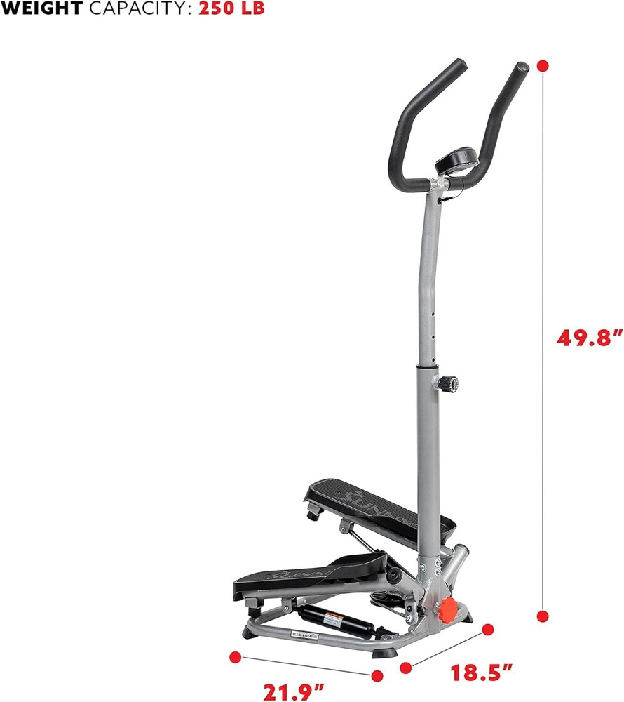Sunny Health & Fitness Steppers for Exercise at Home Exercising Workout Cardio Climber Thigh Space Squat Twist Stepper Advanced Twisted Resistance Band Step with Optional Free SunnyFit App Connection Item Description About this item 【LOW-IMPACT】The Twist Stair Stepper low-impact workout experience, allowing users to tailor intensity levels, engage in effective cardio, target leg muscles, incorporate interval training. 【TWISTING STEPS】The lateral side-to-side action imparts a fluid step motion, engaging different muscles compared to conventional step machines, providing a comprehensive and dynamic workout experience. 【STURDY HANDLEBAR SUPPORT】The sturdy handlebar provides essential support and balance, allowing users to maintain proper posture and stability during their workouts, ensuring a safe and effective exercise experience. 【LCD MONITOR WITH COMPREHENSIVE METRICS】The integrated LCD monitor displays essential metrics including calories burned, step count, scan function, and total count, offering users real-time feedback on their progress. 【QUIET AND SMOOTH】Equipped with quiet and smooth hydraulics, ensuring a noise-free and seamless workout experience. This feature allows users to exercise without disturbing others, making it ideal for home use and distraction-free workouts. 【HEIGHT ADJUSTMENT & CUSTOMIZED INTENSITY】The Stepper offers adjustable step height, allowing users to customize the intensity of their workouts. By altering the step height, individuals can tailor the resistance levels to match their fitness goals. 【EASY ASSEMBLY AND STORAGE】Designed for effortless assembly, allowing users to set it up quickly and start their workouts without hassle. Its space-saving design ensures easy storage, making it convenient for users with limited space at home. 【STURDY FRAME FOR STABILITY】Robust and durable frame, providing exceptional stability and support during workouts. This sturdy construction ensures user safety, allowing for confident and intense exercise sessions. 【Sunny Health & Fitness Commitment】A top fitness brand for 20+ years, offers superior products and a dedication to excellence. Count on our committed customer service and enjoy peace of mind with a 1-year warranty on the structural frame. Show more › See more product details *Digital Monitor: Calories, count, time, total count, scan Give your glutes and thighs a noticeable lift with the Sunny Health & Fitness Twist Stair Stepper Machine with Handlebar - SF-S020027. The adjustable handlebar and stabilizer ring will keep you balanced as you take your fitness to the next level. Stay on top of your workout goals by using the integrated digital monitor. The space-efficient design lets you turn your living room into your own home gym in an instant for an effective and convenient fitness experience. The convenient digital monitor displays: count, time, calories, total count and scan. Switch up your routine between steep climbs or quick high intensity shallow steps. The higher the steps, the more resistance is generated. Height modified handlebar allows for quick, easy, and simple adjustments. The stabilizing ring at the foundation of the stepper provides a solid and unshakeable base with which to push your step and climbing workouts to the limit. The lateral side-to-side action imparts a more fluid step motion and works out different muscles than conventional step machines. The non-slip handlebars help you keep a steady grip and maintain balance while stepping. Designed to maximize space efficiency while providing a reliable and convenient machine for home fitness. Expert engineering and quality materials enables the total body advanced step machine to feature a max user weight of 250 LB. Payment We accept payment only through PAYPAL Shipping We ship products worldwide through standard express courier service, it will reach within 7 to 10 days to abroad buyers, we ship the product after recieved clear payment and give full information about shipment to the buyer Return We accept product return within 7 to 21 days from delivery date but product should be in original position and not in damaged condition,the return shipping charges will be buyer responsibility