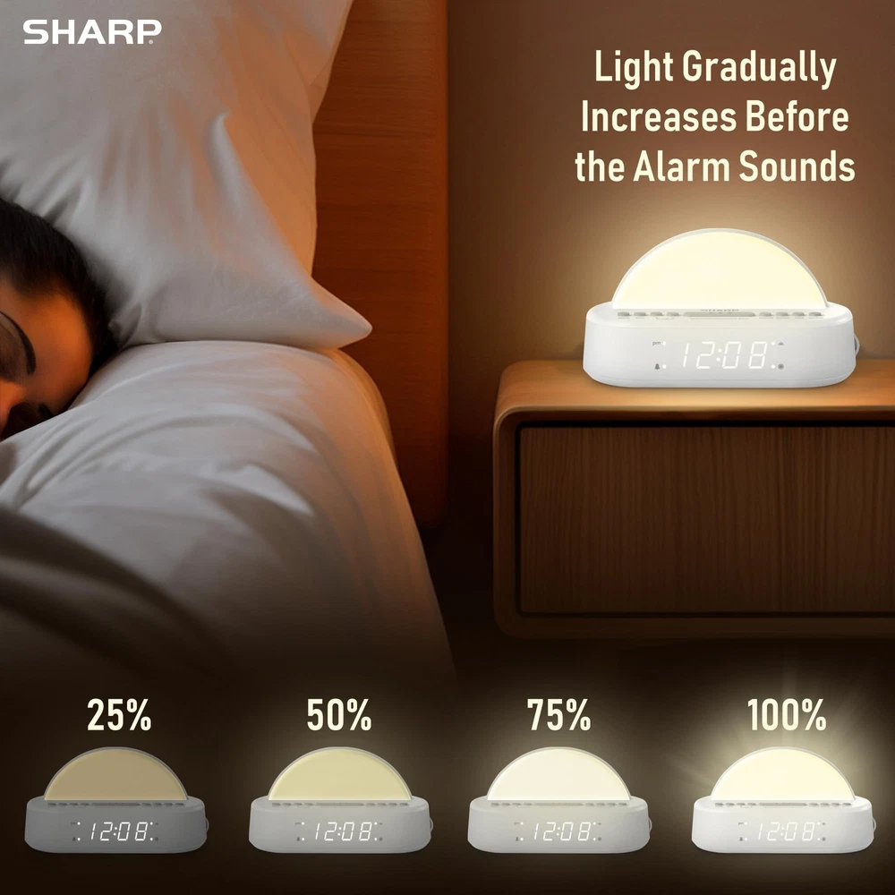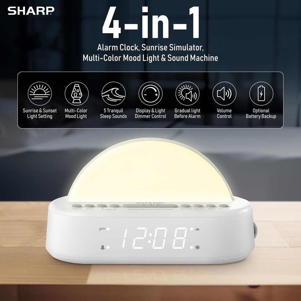 Introducing the Wake-Up Alarm Clock, your ultimate companion for deep, restful sleep. This innovative device features a Sunrise Wake-Up Light and a soothing Sunset light to help you drift off gently. With mood lighting that offers multiple colors, you can create the perfect atmosphere for relaxation. Plus, a handy timer allows the lights to dim gradually as you fall asleep, ensuring a serene environment. Enjoy five tranquil sleep sounds played through a crystal-clear speaker, perfect for heavy sleepers and anyone seeking to restore their rest. The intuitive dimmers let you control the clock display and light diffuser easily, while the battery backup ensures that your time and alarm settings remain safe during power interruptions. When the power is restored, the display lights up automatically, so you never lose track of time. Designed for modern lifestyles, this smart wake-up light fits perfectly on your nightstand and is portable enough for travel. Whether you’re a busy teen, a new parent with a baby, or just someone who loves a natural daylight routine, this clock has you covered. With dimensions of 7.09" x 4.06" x 3.15", it’s compact yet effective, and its aesthetic design complements any bedroom decor. Dive into a world of white noise and natural sounds, and wake up feeling refreshed and rejuvenated. Experience the magic of a sunrise with our alarm clock that mimics sunsets for the ultimate sleep aid. Don't miss out on this modern daylight solution—your path to better sleep awaits! Easy to Use Alarm Clock with 0.7” White LED Digit Time Display in base has Display Dimmer Control with 4 Levels of Brightness: 100%, 50%, 5%, OFF. The perfect digital alarm clock for bedroom with sunrise function and relaxing sleep sounds. This stylish alarm clock also has a 9 Minute Snooze - Get a few more minutes of sleep with built in snooze function! Wakeup to the Sunrise Light 30, 60 or 90 Minutes Before Your Alarm Time. Chose the duration of the perfect amount of time to wake you up and the light will gradually increase the level of brightness. Multicolor Mood Light with 8 Color Modes: Warm White, Yellow, Red, Green, Blue, Blue & Magenta Mix, Green & Yellow Mix, Rainbow. Mood Light Dimmer Control has 5 Levels of Brightness: 100%, 75%, 50%, 25%, 5% - Fall Asleep to the Sunset Light or Mood Light for 30, 60 or 90 Minutes Before Your Desired Bedtime 5 Tranquil Sleep Sounds: Calm, Rain, Thunder, White Noise, Lullaby - Sleep Sound Time for 30, 60 or 90 Minutes. Set to your desired level of sound with 15 levels of sound to create the perfect relaxing environment for your room. ELECTRIC POWERED with “NO WORRY” BATTERY BACKUP: Plug into standard household wall outlet (This alarm clock is compatible with 110V/120V power outlets) to power the clock. Battery Backup (Requires 2 x AAA batteries (not included)) This clock is electric operated; The battery backup is used for storing the time and alarm settings if the power is interrupted. During battery backup the clock’s display will not be lit. Once the power is restored the display will re-light.
