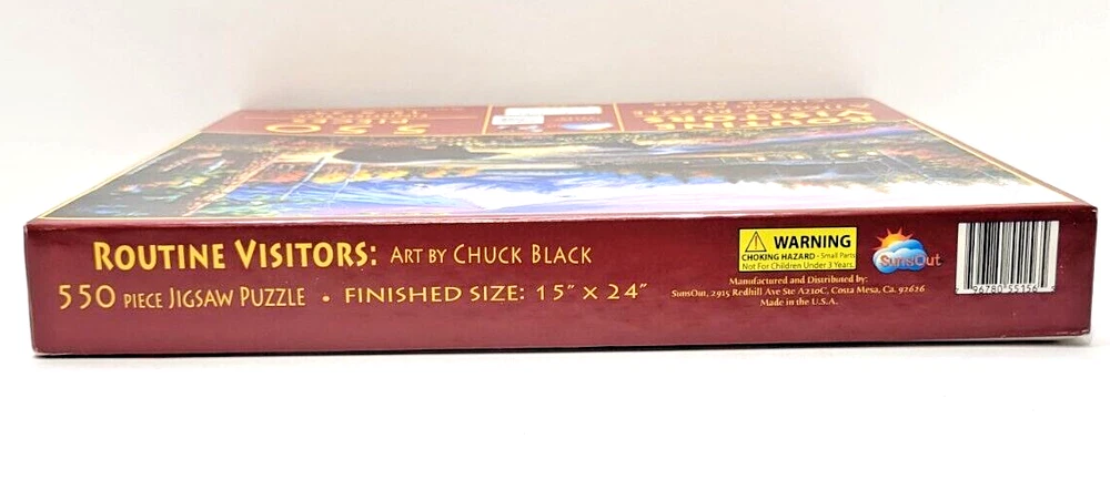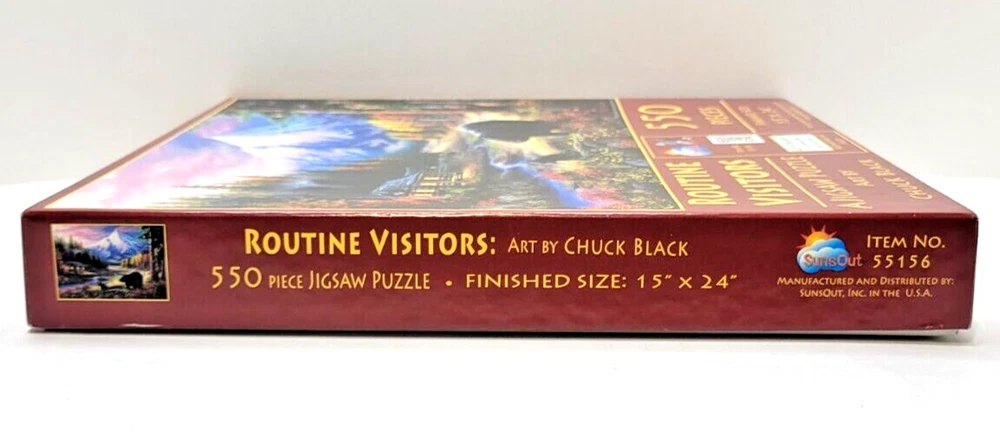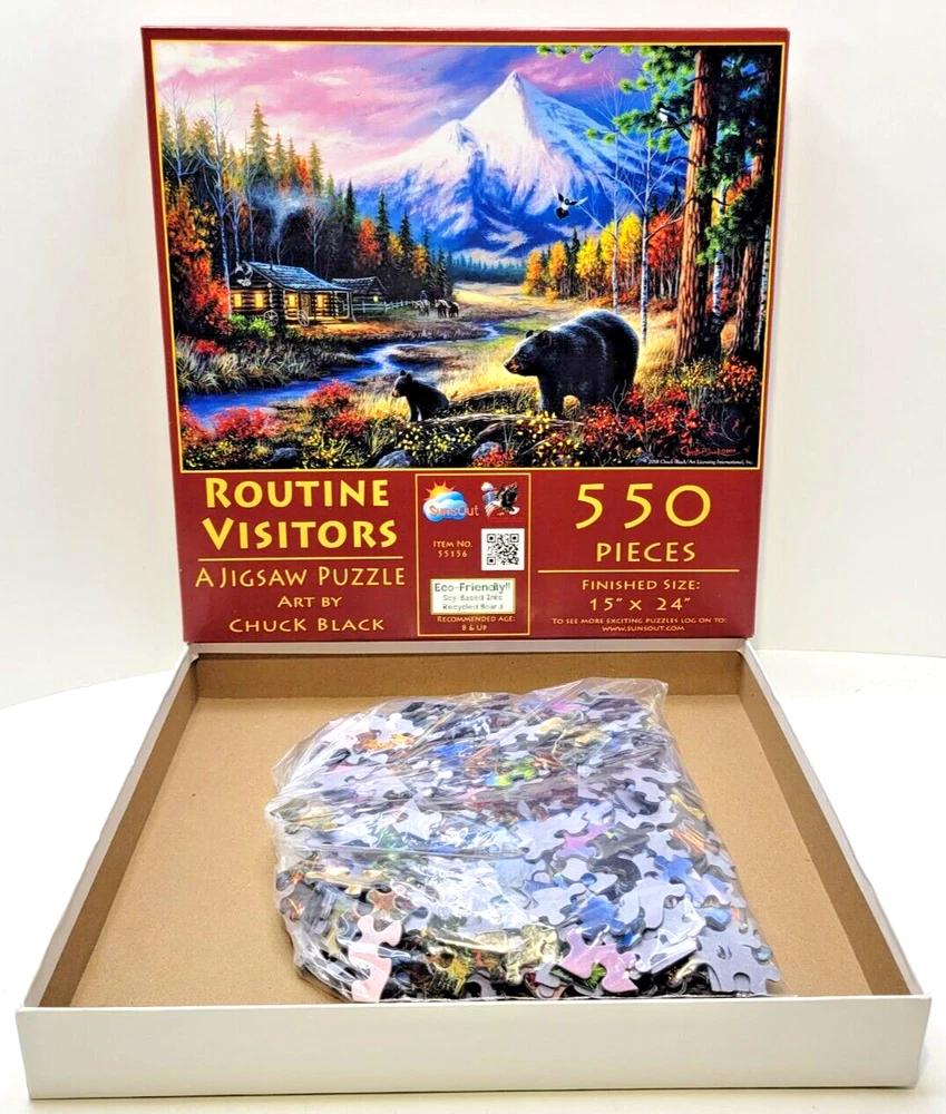 This beautiful 550-piece jigsaw puzzle features a beautiful nature scene created by artist Chuck Black. The intricate design captures the beauty of routine visitors ( Bears ) to a peaceful setting. The puzzle pieces are crafted from durable cardboard material and suitable for ages 8 and up. The vibrant multi-color theme is perfect for puzzle enthusiasts who love a challenge. With its impressive size of 15" x 24", this puzzle is sure to provide hours of entertainment for the whole family. Doing puzzles has some hidden benefits. Excellent qualities : Cultivate concentration, patience, and temper your will Movement development : Train hand-eye coordination and precise small movements Spatial intelligence : Improve visual discrimination of colors and shapes Critical thinking ability : Understand the relationship between parts and the whole, and draw inferences from one example to explore the future Relaxes your mind : Relieve work pressure and release yourself Brain development : Enhance memory and may help prevent brain degeneration We did not work the puzzle or count the pieces, but we verify the number count at your request. Each item we ship is carefully packaged to prevent any damage and is shipped immediately with tracking.