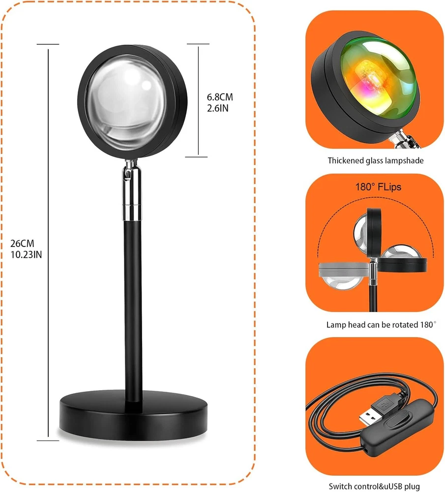 Sunset Lamp Projector Multi-Color Multi-Mode, Dimmable, Remote & APP Product Details Base Material: Aluminum Product Dimensions: 4.7"D x 4.7"W x 12"H Lamp Type: LED Shade Color: Multicolor Shade Material: Aluminum Switch Type: Remote Style: Art Deco Brand: Spacenight Color: Remote & APP Special Feature: The APP offers endless color options, with the remote control having 16 preset sunset hues to choose from. In Music mode, the lights dance gracefully to the rhythm. There is also a Thoughtful timing function that automatically adjusts the lighting. Bathed in the radiant glow of the simulated setting sun, kindling a quiet joy that lingers in the heart. Light Source Type: LED Material: Plastic, Metal Room Type: Room Recommended Uses For Product: Decoration Power Source: Battery Powered Controller Type: Remote Control Number of Light Sources: 2 Connectivity Technology: IR Included Components: Remote Control Is Waterproof: False Bulb Shape Size: A19 Mounting Type: Tabletop Wattage: 6 Watt-hours Number of Items: 1 Lighting Method: Adjustable Control Method: App Indoor/Outdoor Usage: Indoor Specific Uses For Product: This gorgeous sunset scene is breathtaking, bringing a sense of tranquil calmness to the heart. Water Resistance Level: Not Water Resistant Installation Type: Tabletop Number of Pieces: 1 Connectivity Protocol: Wi-Fi Efficiency: Energy Efficient Voltage: 5 Volts (DC) Is Cordless?: No Manufacturer: Spacenight Part Number: Sunset Lamp 01 Item Weight: 10.5 ounces Item model number: Sunset Lamp 01 Special Features: The APP offers endless color options, with the remote control having 16 preset sunset hues to choose from. In Music mode, the lights dance gracefully to the rhythm. There is also a Thoughtful timing function that automatically adjusts the lighting. Bathed in the radiant glow of the simulated setting sun, kindling a quiet joy that lingers in the heart. Batteries Included?: No Batteries Required?: No Product Dimensions : 4.7 x 4.7 x 12 inches; 10.48 ounces Item model number : Sunset Lamp 01 Manufacturer : Spacenight Base Material: Aluminum Product Dimensions: 4.7"D x 4.7"W x 12"H Lamp Type: LED Shade Color: Multicolor Shade Material: Aluminum The sunset lamp has a kaleidoscope of brilliant colors - Immerse yourself in endless adjustable colors (infinite color options through app control), and 16 fixed presets, from warm sunset orange to cool midnight purple. We have all you need! Effortless control sunset lamp - Easily tailor the lighting to a comfortable setting based on your mood, through the intuitive app or handy remote. Adjusting the sunset light's brightness and color is effortless. Thoughtful timing function - You can now set the lights to turn on and off on a schedule, mimicking the sunrise and sunset to welcome a new day or help you fall asleep. When music mode is on - lights dance gracefully to the rhythm, pulsating with energy. Optimized algorithm syncs lighting with music. Sunset lamp Use the APP & remote control to switch colors. Lamp Size: 270*100*100mm Power Supply: 6W Voltage and Current: 5V / 1A Power Supply Mode: USB Direct Plug Material: Iron Base + Aluminum Head Casting Weight: 0.8lb/350g