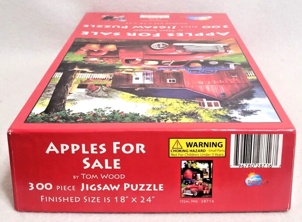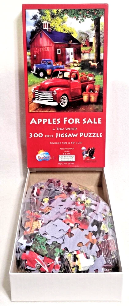 Get ready for a delightful challenge with this 300-piece jigsaw puzzle featuring an artistic depiction of a farm scene by Tom Wood. The puzzle showcases a colorful farm truck, a barn, and an bushels of juicy apples for sale. The puzzle pieces are interlocking and easy to handle, perfect for children ages 8 and up as well as adults. The puzzle is made of high-quality, recycled board material and comes from a smoke-free household. Enjoy putting together this fun puzzle and experience the joy of completing a masterpiece. Made in the United States, this puzzle is an excellent addition to any puzzle collection and makes for a fantastic gift. Doing puzzles has some hidden benefits . Excellent qualities : Cultivate concentration, patience, and temper your will Movement development : Train hand-eye coordination and precise small movements Spatial intelligence : Improve visual discrimination of colors and shapes Critical thinking ability : Understand the relationship between parts and the whole, and draw inferences from one example to explore the future Relaxes your mind : Relieve work pressure and release yourself Brain development : Enhance memory and may help prevent or slow brain degeneration We did not work the puzzle or count the pieces, but we verify the number count at your request. Each item we ship is carefully packaged to prevent any damage and is shipped immediately with tracking.