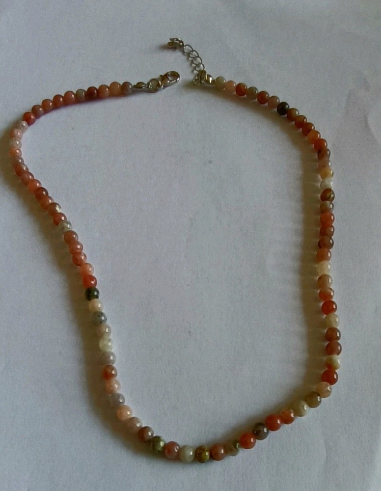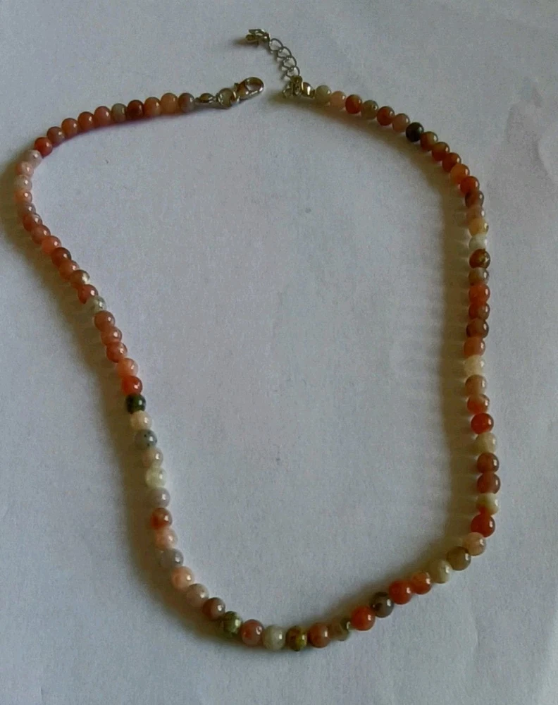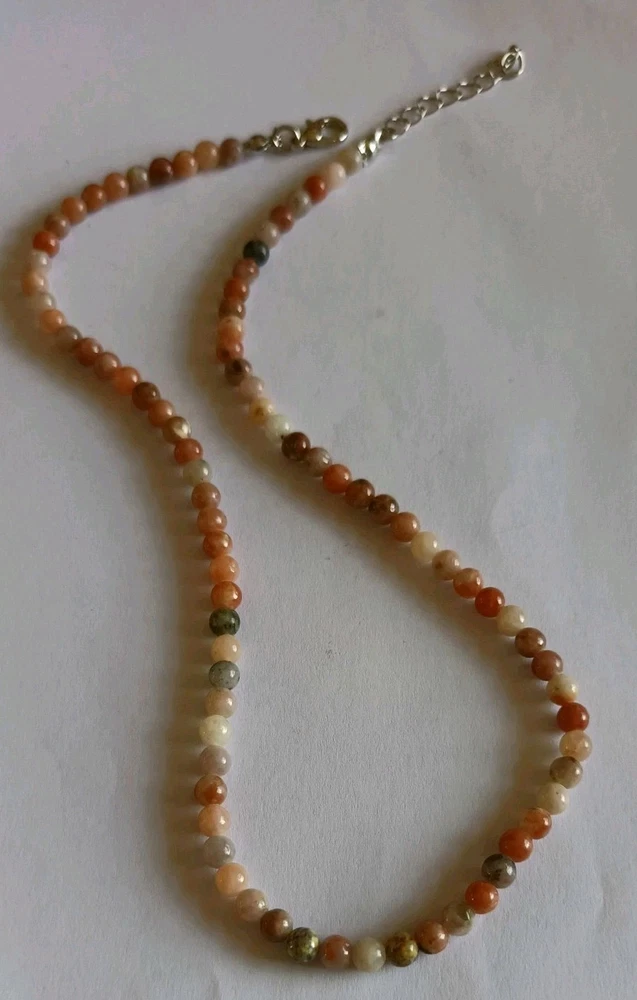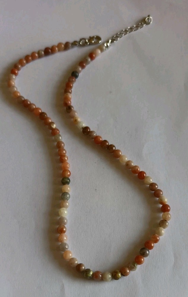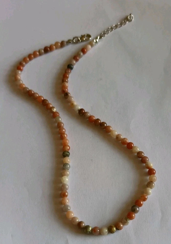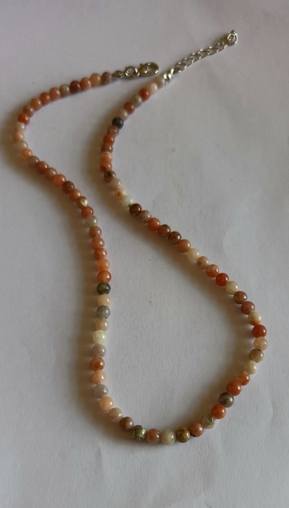Crafted with a touch of simplicity and elegance, this sunstone choker necklace brings a burst of minimalist charm to any ensemble. The necklace features a series of round, natural sunstone beads, each boasting a vibrant multicolour hue that captures the essence of the gemstone's warmth and depth. The piece is completed with a silver-plated finish, providing a subtle contrast that enhances the stones' eye-catching colours. Designed to sit perfectly at a length of 40cm,with extension chain.The necklace is adjustable for a comfortable fit around the neck. Its lobster clasp closure ensures secure fastening, making it an ideal accessory for a variety of occasions, from birthdays and anniversaries to Mother's Day and beach holidays. This versatile choker style is also suitable for those looking to celebrate healing and awareness themes in their jewellery collection.