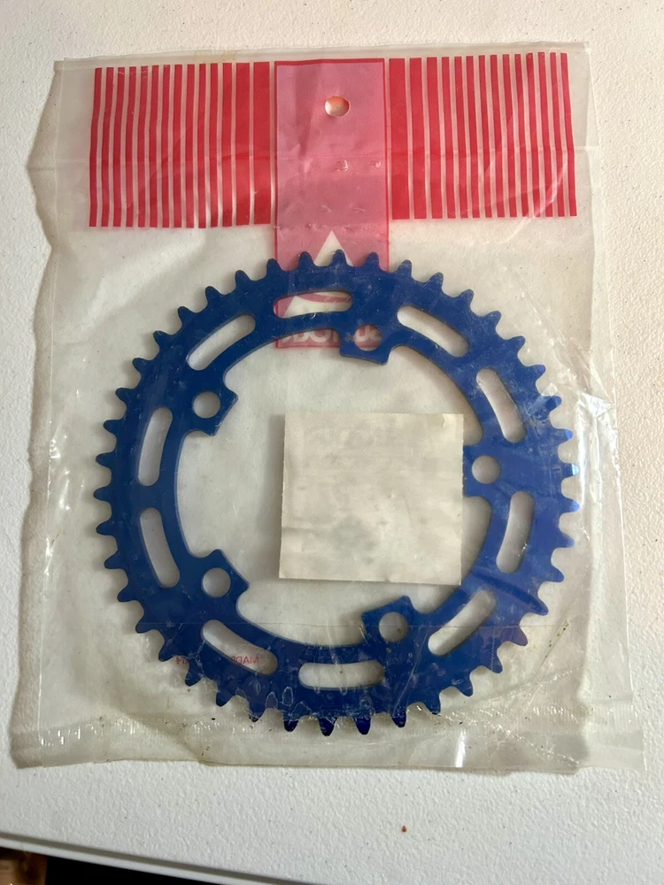Brand:SuntourMounting Type:5-ArmCompatible Bike Type:BMX Bike, BMX Bike - Old School, BMX Bike - Racing, CruiserDistance Between Bolt Holes:110 BCDMaterial:AluminumNumber of Teeth:42 ToothColor:BluePart Type:ChainringCountry/Region of Manufacture:JapanItem Weight:2.7 ozNumber of Items:1