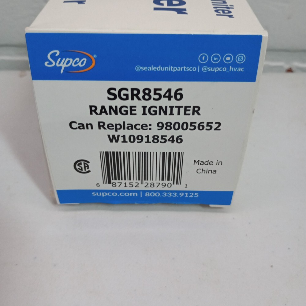 The Supco Range Ignitor SGR8546 W10918546 is an essential component designed to ensure your oven functions with precision and reliability. With its silver finish, it complements a range of kitchen aesthetics while providing a functional solution for your mechanical components. This oven igniter is compatible with model number 98005652 and includes the necessary parts to facilitate a seamless installation process. Crafted by SUPCO, a brand synonymous with quality and durability, this item is specifically tailored for longevity and performance. The package contains a single oven igniter, identified by MPN SGR8546, which is suitable for those in need of a replacement part or looking to maintain their oven's optimal functionality.