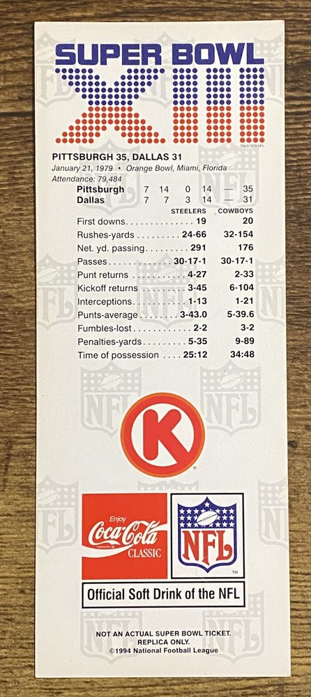 Relive the excitement of one of the most iconic Super Bowls with this replica ticket from Super Bowl XIII. This ticket features the Pittsburgh Steelers facing off against the Dallas Cowboys in a showdown that will go down in history. The ticket is a reproduction of the original and is a must-have for any football fan or collector. This vintage ticket is a great addition to any sports memorabilia collection and is perfect for displaying in a man cave, game room, or office. Celebrate the legacy of the Steelers and Cowboys with this piece of NFL history.