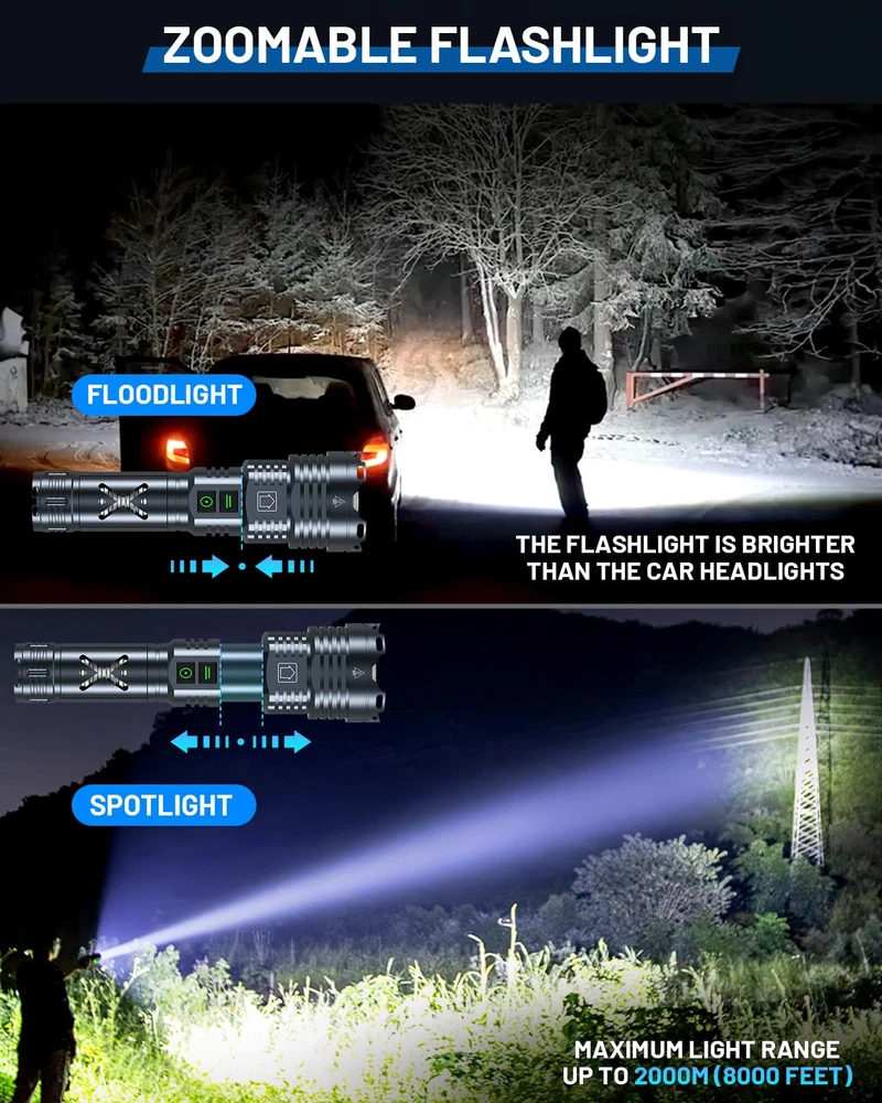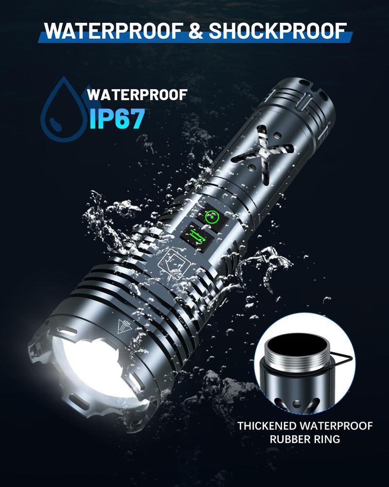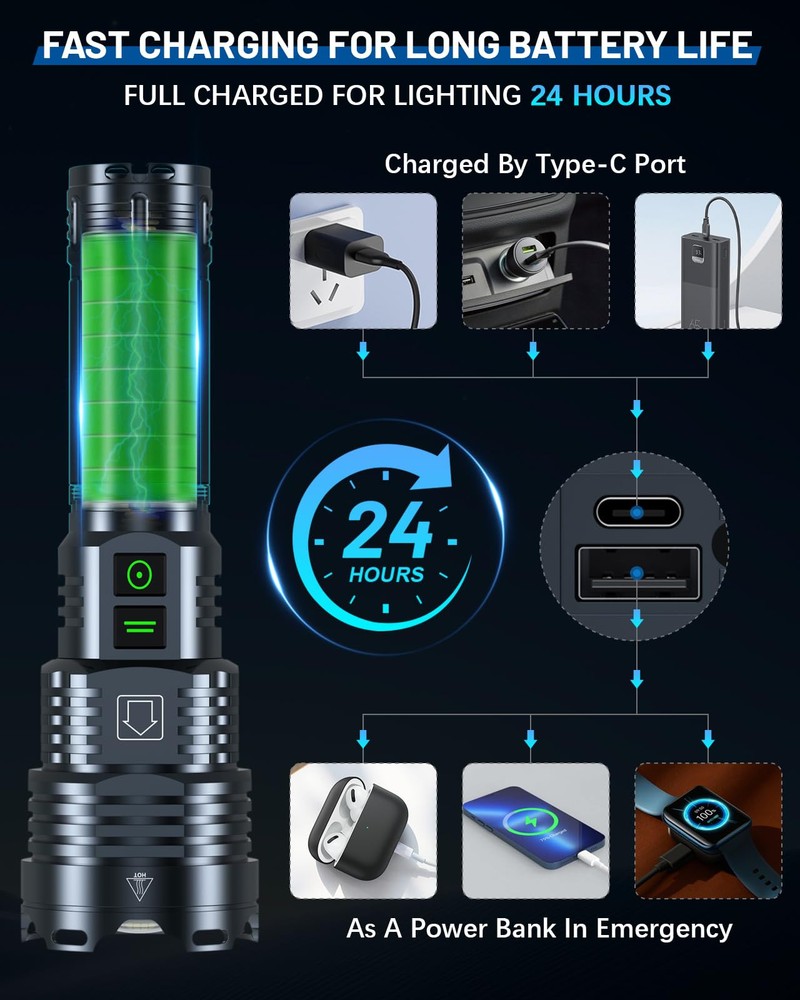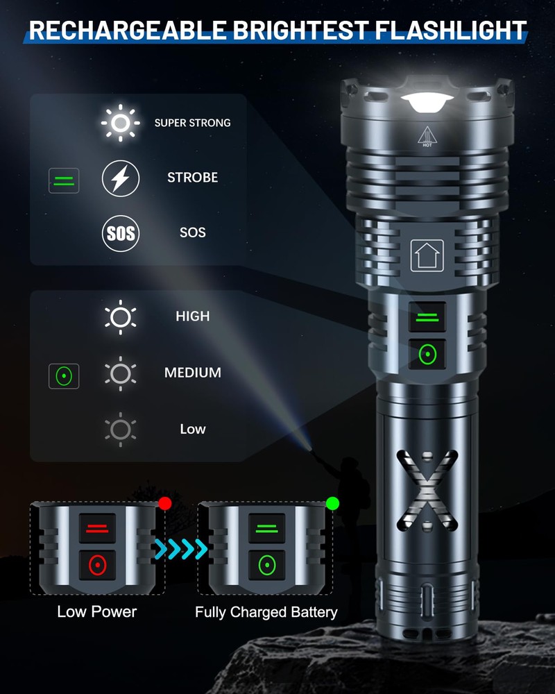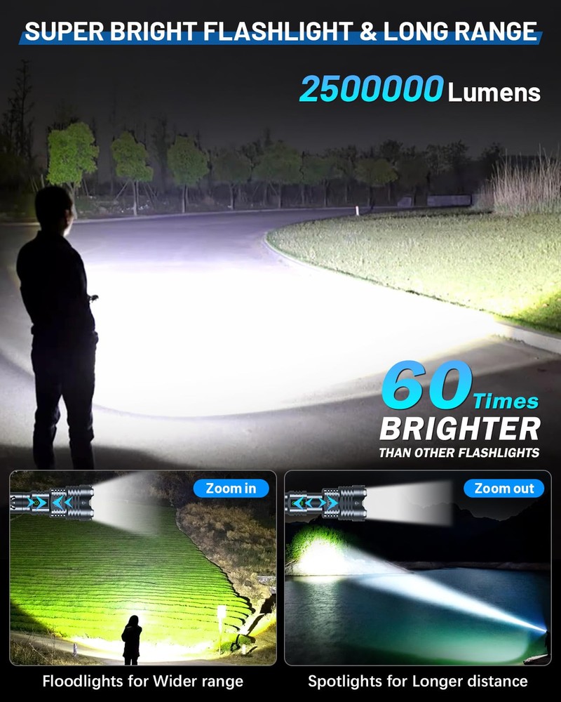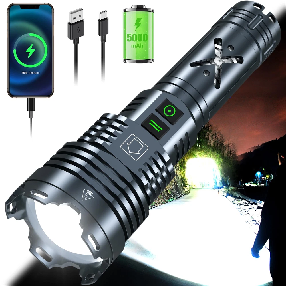 【Brightest Flashlight for Outdoor Enthusiasts】 The super bright flashlight produces a up to 2500000 lumens brightness, focused beam can lights up the whole room even the darkest corners (over a beam distance of 8000ft/2000m) . This is the perfect powerful flashlight for everyday use. It's great for camping, hiking, or simply navigating around work at night. 【Adjustable Focus & 6 Light Modes】This high lumen flashlight has 1 brightness adjustable button for High-Medium-Low lighting mode and 1 function button for Super Strong-Strobe-SOS lighting mode. As you need, you can stretch the head of the camping flashlight to adjust the focus. The Spotlight for Long-distance Observation and the Floodlight for large-area illumination. flashlights can emit a very bright light that penetrates darkness effectively and illuminates long distances. 【USB Charging Indicator & Long-lasting Battery】Tactical flashlights built-in USB charging port allows charging from power banks, wall outlets and laptops for convenient indoor and outdoor charging. The switch button Lights Up Red indicate the need for Charging, and Green to indicate a Full Battery. The rechargeable flashlights battery provides lighting up to 20 hours of brightness (low mode). 【Durabe & Ip67 Waterproof】This powerful flashlight is made of high quality space aluminum alloy and is tested for high drop and fall protection. The build quality is strong enough to withstand harsh usage environments and is suitable for extreme weather such as rain, snow and sandstorms. Meanwhile, the Ip67 rated waterproof design gives you peace of mind when exploring the outdoors. 【Value LED Flashlight & 2 Years Customer Service】You will get 1*Super Bright Flashlight, 1*5000mAh Powerful Rechargeable Battery,1*Type-C Charging Cable, 1*Lanyard and 1*Instruction Manual, 1*Packing Box. We provide 7/24 hours customer service. If you have any questions about the brightest flashlight, please feel free to contact us. We will be happy to help you solve the problem. We provide 2 years after-sales service and unconditional return flashlight policy, so that you can use it with confidence.