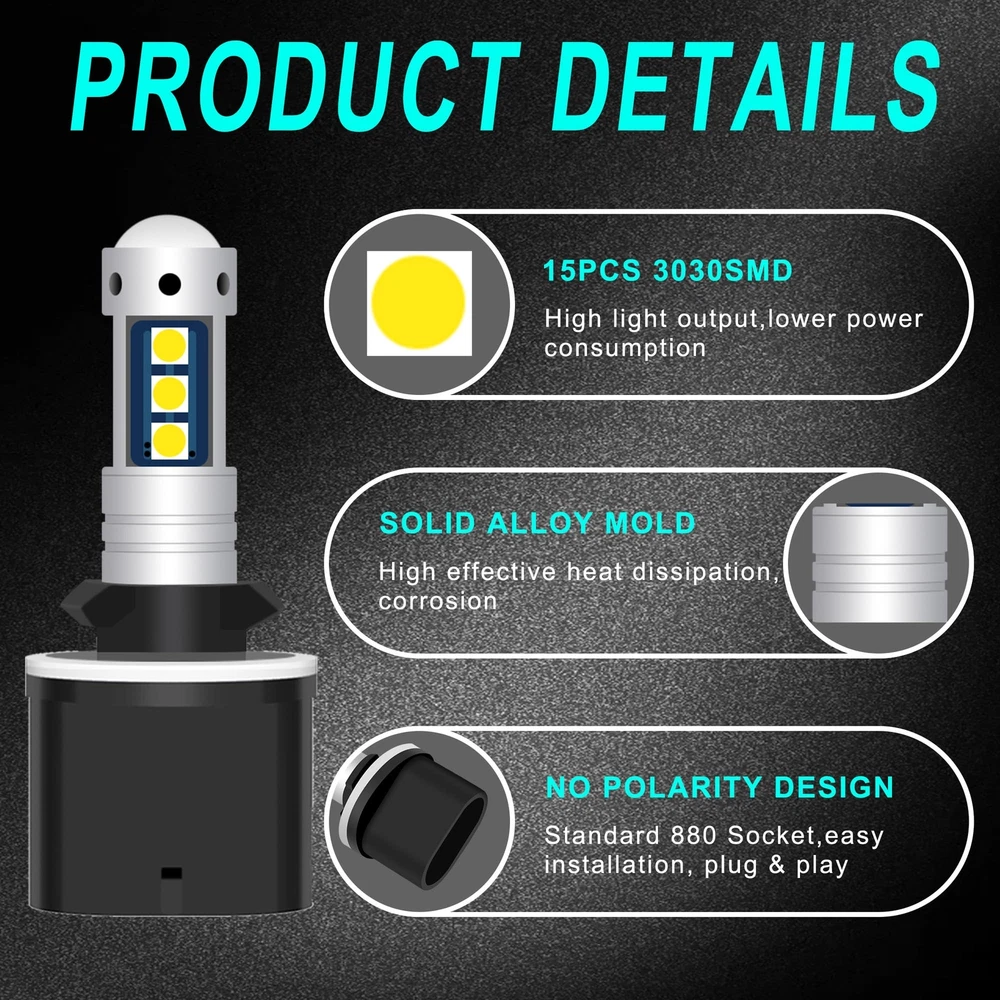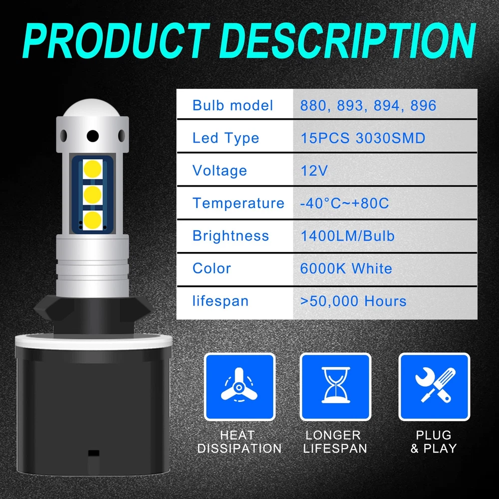 Store Categories Store Categories Other Super Bright 880 890 893 883 892 6000k White Led Bulb Fog Light or DRL, Over Product Description Super Bright: This set of 2 bulbs in the 880 890 893 883 892 series is equipped with 15 advanced 3030 LED chips each, offering significantly brighter light than the original bulb. Designed for a 360-degree beam angle, they provide superior light output and extended reach, greatly improving visibility while being energy efficient. Heat Dissipation:Our LED bulbs feature an advanced built-in intelligent IC driver and are made with high-grade aviation aluminum material. This innovative design ensures better performance, stable input current, Ensure the secure temperature range and consistent brightness out to reach life up to 50,000 hours. Note: Please be aware that the Amazon filter system may not be 100% accurate. The bulb size can vary depending on the trim of your vehicle. We recommend double-checking your owner's manual or the original bulb size to confirm compatibility before placing an order. Easy Installation: As a replacement for original bulb, Our Bulb adopts mini all-in-one design, the body is directly connected to the original plug, plug and play. Service:If you have any questions or encounter any issues with your order, please don't hesitate to let us know. Our product enjoys 24-hour customer service, ensuring that you can buy with confidence and receive the support you need. Payment Policy Shipping Policy Returns Policy Contact us FAQ Payment Policy 1. Payment must be completed via PayPal within three days following the purchase date. 2. I t is important to ensure that the address provided on PayPal matches the one listed on eBay. 3. I f you have successfully bid on an item, please arrange payment within four days to avoid receiving an Unpaid Item Reminder from eBay, w hich could negatively impact your eBay history. 4. B uyers should be aware that they are liable for any import duties, custo ms charges, and taxes that may apply. We recommend consulting with your local customs office to ascertain any extra expenses prior to finalizing your order. Shipping Policy All items will be shipped in 48 hours after receiving your payment . 1. To USA , take standard(10-20 working days) or expedited shipping(4-6 working days). expedited shipping need charge extra shipping fee. 2. To other countries, take standard(15-25 working days) or expedited shipping(5-8 working days). expedited shipping need charge extra shipping fee. Returns Policy We offer 30 days return policy. Please contact us within 30 days t from the date you receive your order if you have any issues with the product or want return .Refund will be send after we got your resend package. All returned items should be in the original packaging , return tracking information should be provided . Buyer is responsible for return shipping cost due to the problem not caused by item quality itself . Don''t worry , please remember we also hope business smooth, our mission like google "Don't be evil" and "communication make life better". Contact us Our office hours are MONDAY - FRIDAY 9:00PM - 6:00PM PST, but we will response you once we get your message .There will be some delay on response if you send message or E-Mail on weekend. We are always been trying to provide best service and reliable products for every customer. If you are satisfied with the product you received,please leave us positive feedback. If you are not satisfied for any reason, please do not be quick to leave negative or neutral feedback.We will work hard to make sure every customer 100 percent satisfied, and resolve any problem for you. FAQ Q1: Will this bulb fit my vehicle? A: We can match almost any vehicle to one of our bulb sizes. eBay only lets us include partial vehicle fitments per listing, but if your vehicle does not show up on the compatibility table at the top of our listings, welcome you to contact us for free consulation before purchasing a product. Q2: My item has not arrived, what's taking so long? A: Sometimes items take longer than expected, especially if it’s going far or to rural area. Check with your post office to see if your item has been held up. Sometimes USPS will not update a tracking number until it has arrived at its destination. If your item still has not arrived after a few days, let us know so we can double check for you and help solve it asap. Q3: Do I need to mention the Year, Make and Model in the notes when place order? A: YES. Please include the Year, Make, and Model in the notes section during checkout to ensure you receive everything needed for your kit! Q4: My bulbs wo n't fit, help! A: Special bulb holder may be required. See if you can take the holder from the stock bulb. If not, let us know. The bulb size may be wrong, double check the item you received with the item you ordered. Do you have an aftermarket lighting housing? These may not be perfectly fitted for aftermarket bulbs and will require some manual modifications. Q5: Neither side lighting up? Both sides flicker, flash, or work inconsistantly. A:Check the headlight fuses, and then check the ballast plugs to insure correct installation. If this doesn't work, there may be a voltage problem with the vehicle. You probably just need a relay or capacitor. Q6: WARNING ABOUT POLARITY Unlike halogen bulbs, LED are polarity sensitive. BEFORE you start your LED kit installation, verify the polarity on your vehicle by simply plugging the LED bulb into your vehicle socket. - if your light turns on, please proceed to install both bulbs onto your vehicle. - if your light DOES NOT turn on, disconnect the bulb and flip the socket in order to reverse the polarity (this will not damage your vehicle electrical system in any way). Once you made sure the LED bulb turns on, please proceed to install both bulbs onto your vehicle. Note: There is no convention when it comes to polarity. Different car manufactures have different polarity setup, even within the c