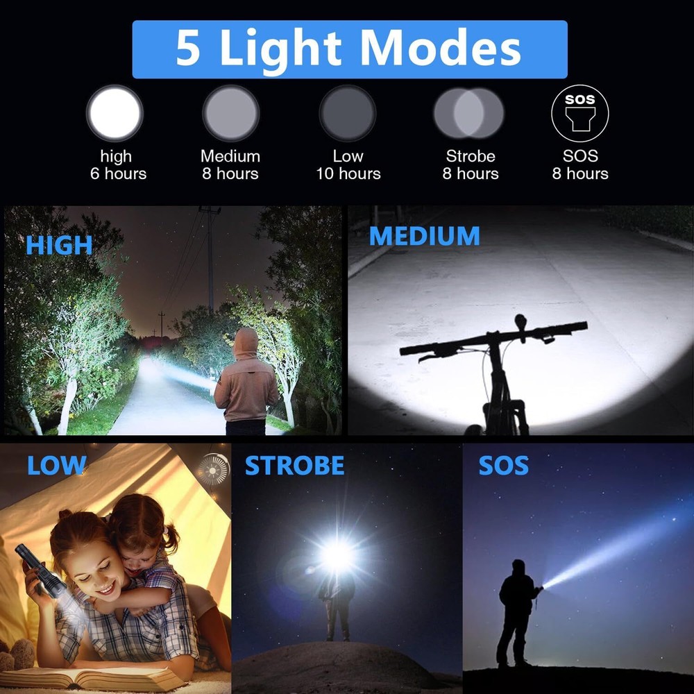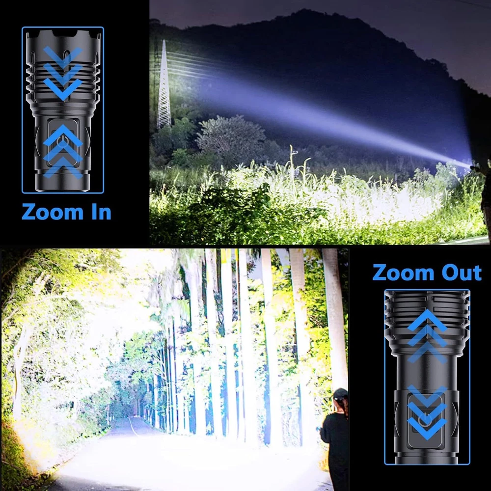 Flashlights High Lumens Rechargeable - 990000 Lumen Led Black Product Details Special Feature: Long Throw Flashlights High Lumens, Adjustable Focus LED Rechargeable Flashlight, Adjustable Light Modes, Rechargeable Flashlights, High Powered Flashlight Long Throw Flashlights High Lumens, Adjustable Focus LED Rechargeable Flashlight, Adjustable Light Modes, Rechargeable Flashlights, High Powered FlashlightLong Throw Flashlights High Lumens, Adjustable Focus LED Rechargeable Flashlight, Adjustable Light Modes, Rechargeable Flashlights, High Powered Flashlight See more Color: Black Power Source: Battery Powered Light Source Type: LED Rechargeable Flashlights Material: Aluminum 【Powerful flashlights & Brightest flashlight】:Rechargeable flashlights high lumens Built-in advanced super bright LED chip, with a powerful 990000 lumens output, its beam can pass through dust and fog well, especially suitable for foggy and rainy days with low visibility. It can easily illuminate light up a room up to 2000 square feet with ease. We can even focus on objects up to 1500 feet away, about the length of 3 football fields! A good led rechargeable flashlight suit is also makes the perfect gift for friends and family 【Upgraded Fast Charging】 This USB flashlight is equipped with 2 charging ports, a USB-C port for charging and a standard USB port for discharging, which can be used as a power bank in an emergency. When driving, you can connect the car charger to charge it. The rechargable flashlight can be charged and discharged more than 50000 times. 【Waterproof Flashlights】Led flashlight is made of aviation grade aluminium alloy. The solid body means excellent shock resistance, and even if run over by a truck it still works! Built-in high-stength sealing rubber waterproof ring, suitable for rain, snow or other bad weather. Waterproof, non-slip, and compact design make it a pocket flashlight for all outdoor activities, camping, hiking, fishing, and a powerful emergency flashlights 【5 Modes & Adjustable Focus】: This high powered flashlight has 5 modes: High/Medium/Low/Strobe/SOS. The smooth current conversion system can also better protect the flashlights chip, thus prolonging the service life. We can stretch the head to change the focal length and beam size, it has more powerful long throw in spotlight and wider field of view in floodlight 【Package 】 You will get: 1X rechargeable led flashlight, 1X USB universal charger, 1X USB charging cable, 1X storage box. You will be amazed by the brightness, quality, lifespan and performance of the led flashlight rechargeable