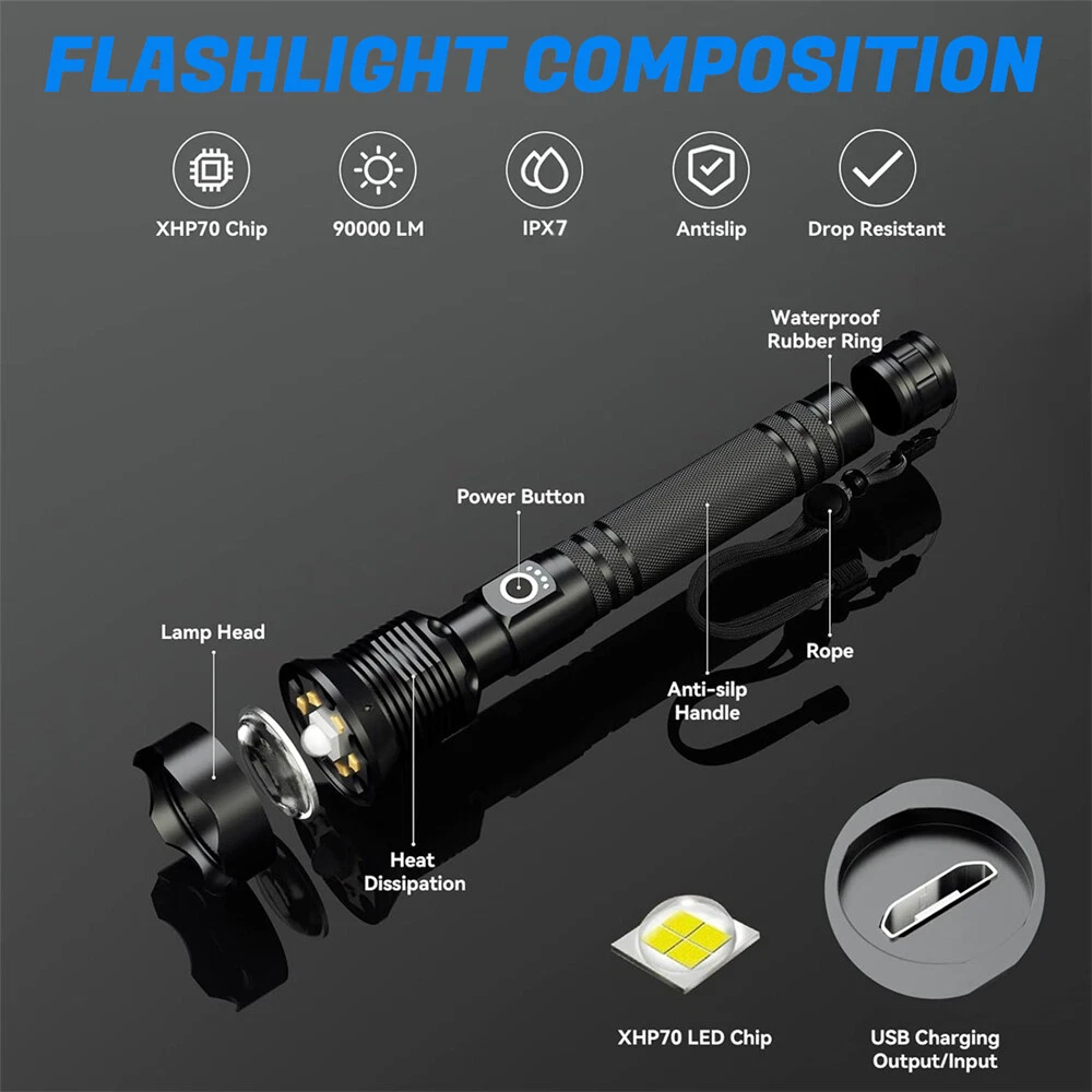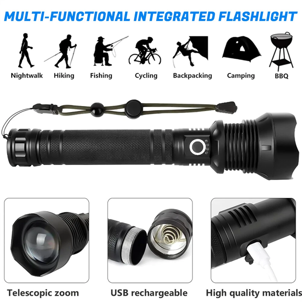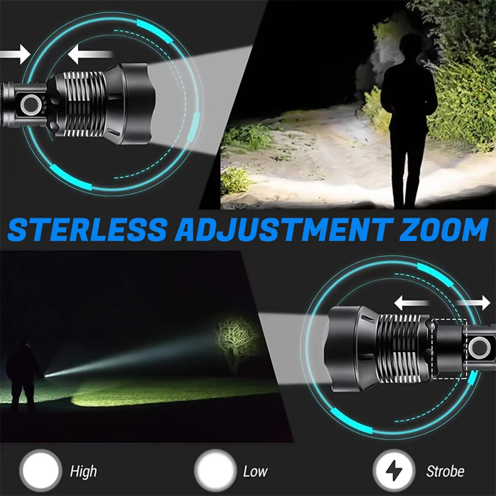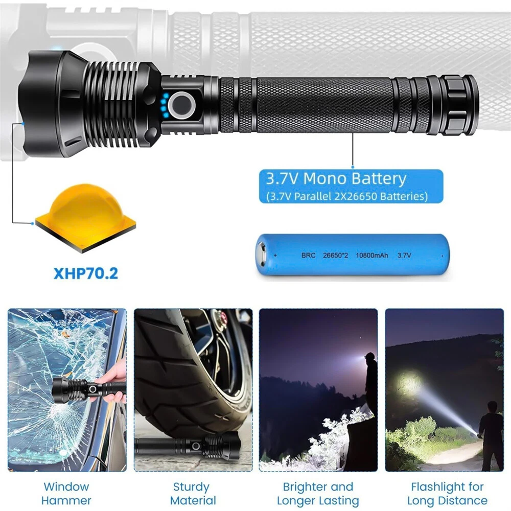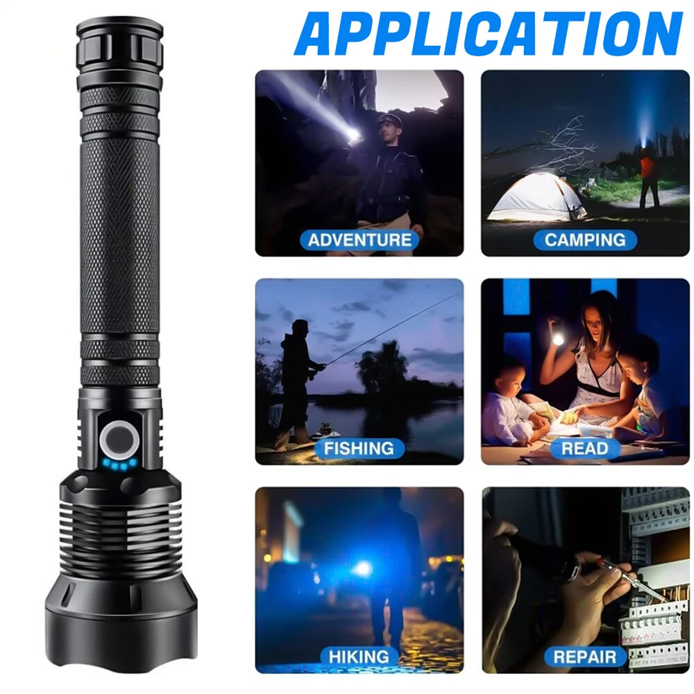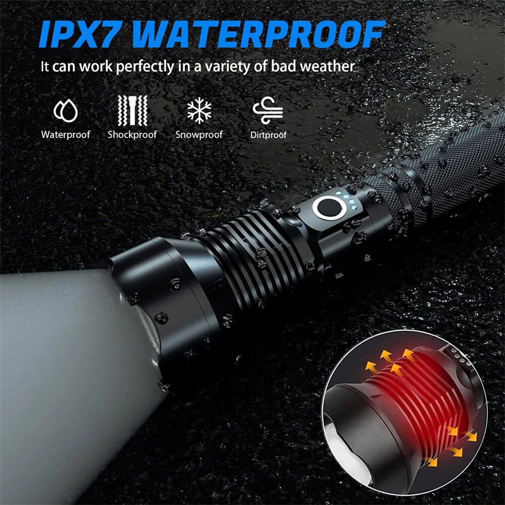 IP Rating: IP65 Battery Technology: 26650 UPC: Does not apply gtin13: Does not apply Voltage: 5V Color: Black Power Source: Battery Operating Range: 1000 m Lumens: 9000000 Lumens Type: Flashlight Brand: Unbranded Lighting Technology: LED Number of Batteries: 2 Features: Batteries Included, Handheld, Magnetic, Rechargeable, Waterproof, With Wrist Strap, Adjustable Focus Material: Aluminum Operating Time: 5-10 Hours