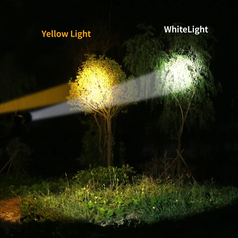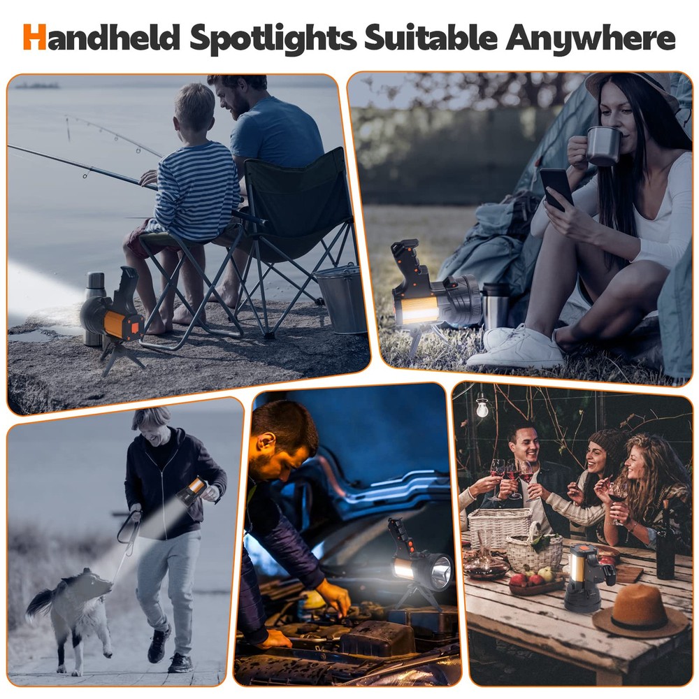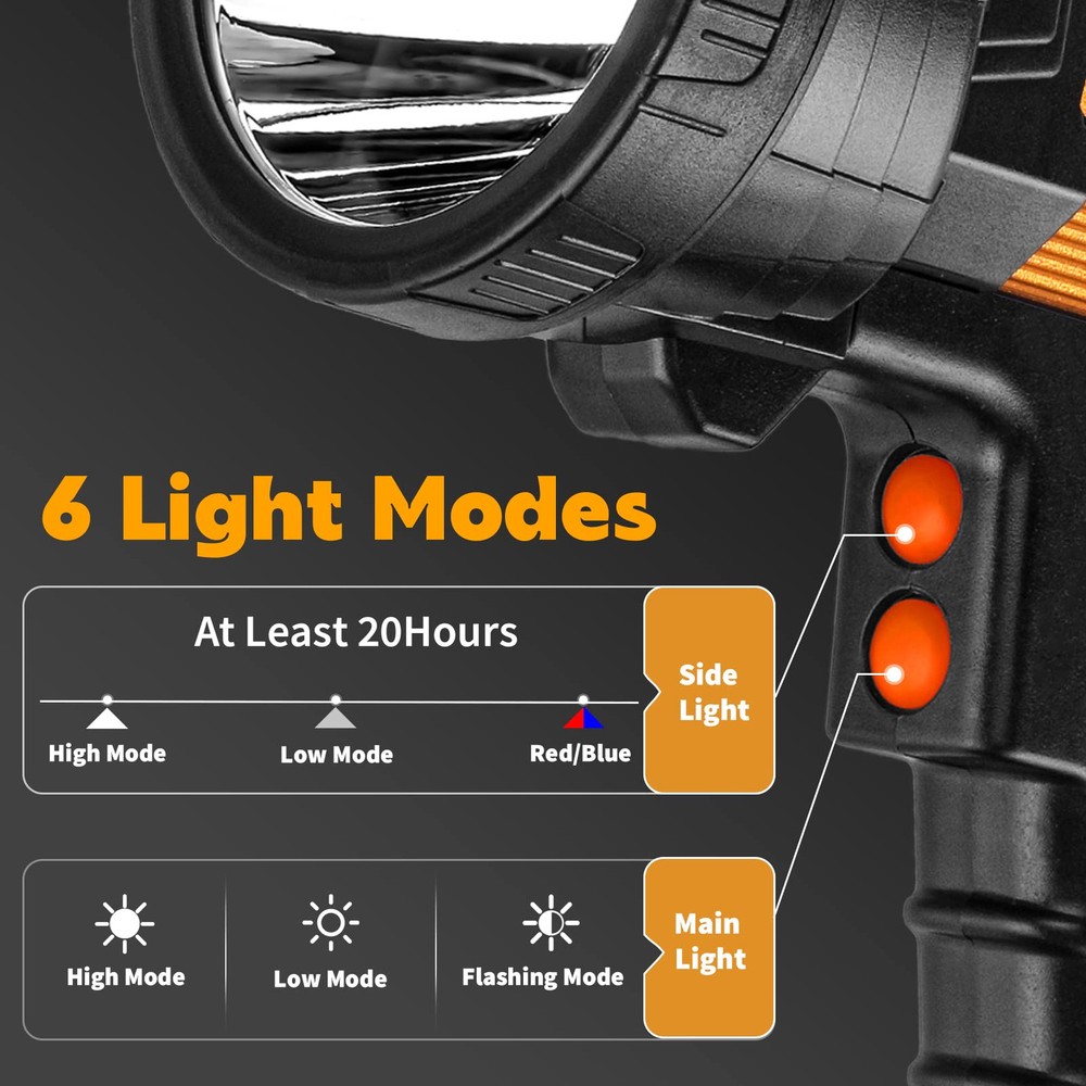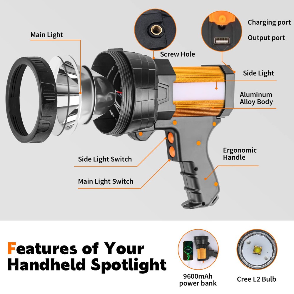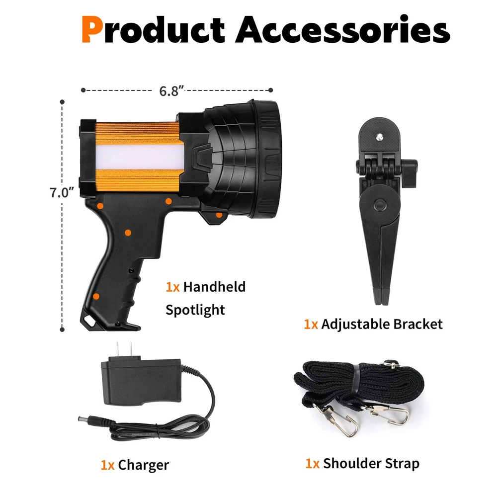 Items specifics: 1.Lighting Source: LED 2.Emitting Color: Yellow 3.Body Color: Gold 4.Head Diameter: 4.0IN 5.Body Length: 6.8IN 6.Side Light Mode: High/Low/SOS 7.Switch Mode: High/Flash/OFF(Long Press 3 seconds Flash/SOS mode on) Package Included: -1 x Handheld spotlight (battery included) -1 x 110v-120V Charger -1 x Shoulder strap -1 x Adjustable bracket -1 x Retail package Superbright Handheld Spotlight: The main light has 3 brightness modes: 1. High light/2. Low light/3.Long press 3 second switch to strobe light. The side light also has 3 brightness light modes: 1. High light/2. Low light/3.Long press 3 second switch to red and blue warning lights. Rechargeable& Intelligent: Built in 9600mA rechargeable battery with overcharge and over-discharge protection devices, thus, it’s very safety and reliable. if fully charge the battery, the charge time about 8 hours and the lighting time up to 10-20 hours. Power Bank Function: The rear the emergency spotlight has a USB interface. It can serve as a power bank for your smartphone or mobile devices in emergency, bringing you much convenience to your outdoor travel. Multiple Use Options: When you walk a dog, the shoulder strap can prevent the rechargeable spotlight falling. The adjustable bracket suit for camping, night fishing and barbecue, perfectly free your hands. Durable Material: The handheld spotlight shell made from military level ABS and aluminium alloy materials, it can prefect protect the spotlight from drops and bumps while in use.