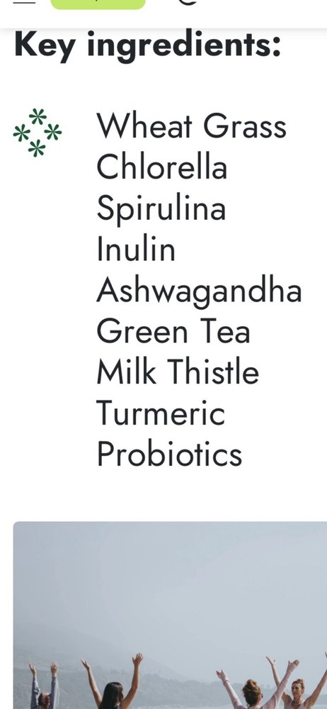 Acai Berry, Barley Grass (Hordeum vulgare), Chlorella, Milk Thistle (Silybum marianum), Spinach, Spirulina, Turmeric, Wheatgrass, Broccoli Powder, Kale Powder, Goji Berry, Beet Root Powder, Strawberry Juice Powder, Coconut Water Powder, Flax Seed Powder, Probiotic Blend 10Bil CFU