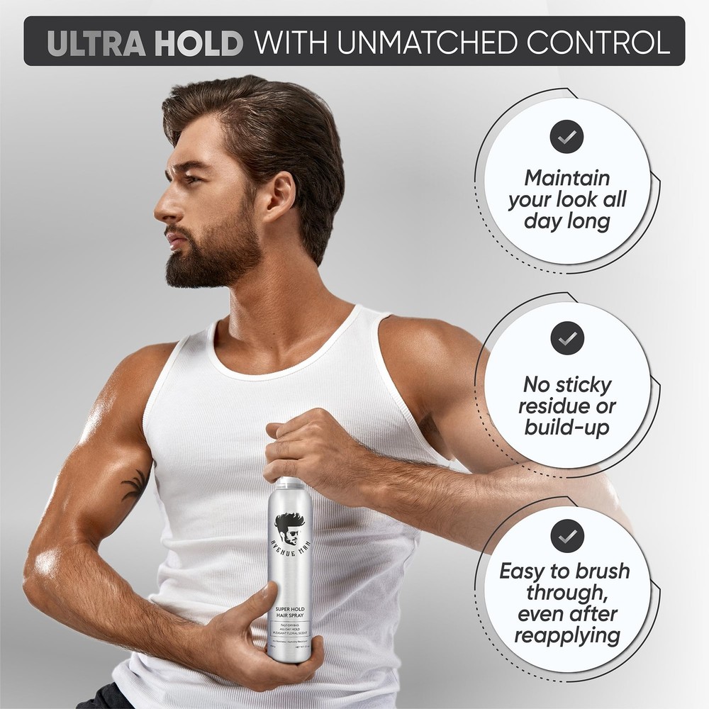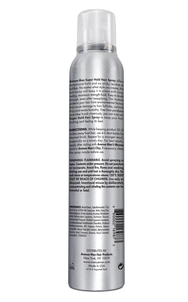 Looking for hair styling products that are natural and healthy? hair products are specifically designed to make handsome, Masculine hairstyles for men with short, medium, or long hair that hold all day long and create a winning style. This highly strong yet fixating hair spray offers exceptional hold and no sticky residue or build-up. Easy to brush through, even after reapplying. Secure your look: Super Hold Hair Spray provides unmatched control over your hair, fixing any loose strands or out of control frizz with a few sprays. Maintain your look all day long with our most flexible hairspray. Hair Styling Formula With Herbal Extracts A paraben-free formula that provides a powerful defense against the elements. The all-natural ingredients in our hair spray will help to prevent additional damage to your hair. Created and Manufactured in California by natural hair product specialists with years of experience, Super Hold Hair Spray comes in Masculine, efficiently designed packaging that was created for hair salons and for the general public. This great hair styling product will help you get your dream job, succeed in business, attract your crush and anything else you are trying to achieve. Order our Super Hold Hair Spray for men NOW and enjoy a perfect control hairstyle all day long. Extreme Hold, Zero Compromise: Lock your style in place all day with ’s strongest mens Hairspray extra hold. Designed for busy lifestyles, this fast-drying formula provides a firm, weightless hold that resists wind, humidity, and sweat—keeping every strand exactly where it belongs Infused with Natural Strengtheners: Packed with lemon peel, mallow flower extracts, and a powerhouse blend of plant proteins, this hair spray for men not only styles but also nourishes. Strengthen and condition your hair while maintaining a flawless, residue-free look. Perfect for fine, dry, thinning, or damaged hair No Flakes, No Buildup, No Hassle: Our extreme hold hairspray provides a super strong yet flexible hold, keeping your style intact without stiffness or residue. Designed for a smooth, natural finish, it won’t leave behind white flakes or product buildup, making it ideal for daily use. The fast-drying, humidity-resistant mist ensures your hair stays polished and controlled throughout the day—whether at work, the gym, or a night out—without the need for touch-ups or reapplication Lightweight, No-Flake Formula for a Natural Look: Experience a hair spray men strong hold that keeps your style in place without crunch or stiffness. The lightweight mist dries instantly, leaving no visible flakes or residue. Hair stays flexible, easy to restyle, and naturally textured—without feeling sticky or weighed down Designed in New York – Premium Quality & Expert Craftsmanship: Developed and formulated in the USA, this high-performance super hold hairspray for men is crafted with precision to meet the highest grooming standards. Free from parabens and harsh chemicals, it delivers professional-grade styling while maintaining the health and integrity of your hair. Engineered for men who demand superior hold, effortless style, and long-term hair care in one powerful formula. Whether you're styling for work, the gym, or a night out, trust in a product designed to keep up with your lifestyle