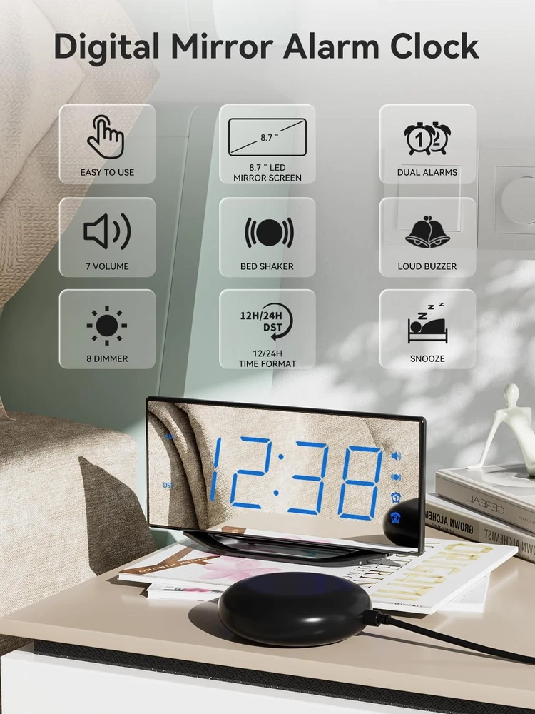 This alarm clock is a game-changer for heavy sleepers! The powerful vibration and loud buzzer ensure I wake up on time every morning. Super easy to set up, and the multiple wake-up modes let me choose what works best. Perfect for deep sleepers or anyone with hearing difficultiesโno more oversleeping! The bed shaker is strong but not disruptive, and the display is clear. Highly recommend for reliable, hassle-free mornings!