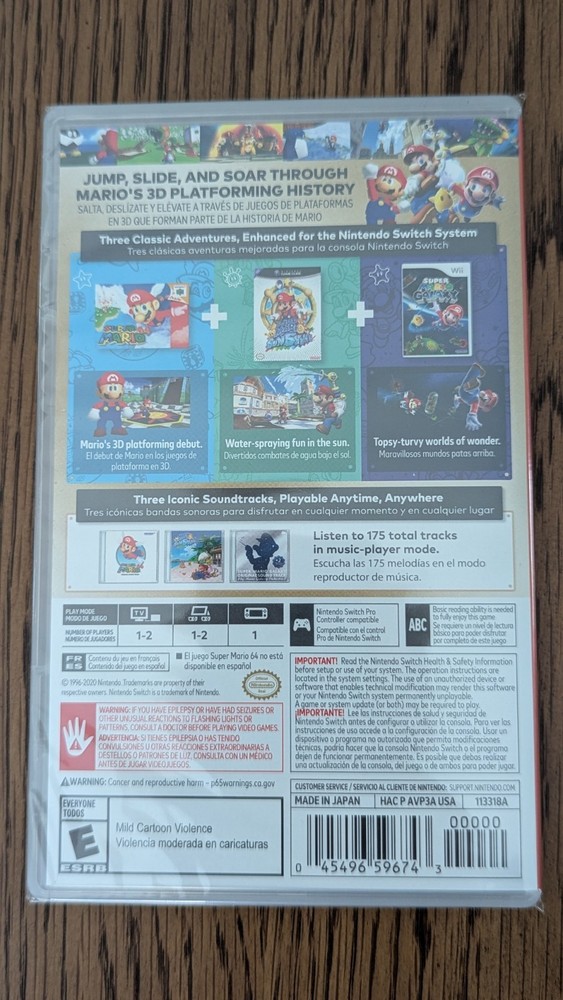 The product is Super Mario 3D All-Stars for the Nintendo Switch, a platformer game published by Nintendo Games. This version includes three classic Mario games in one package, offering gameplay suitable for all ages with an E-Everyone rating. The game is new, factory sealed, ensuring a fresh gaming experience for fans of the franchise.