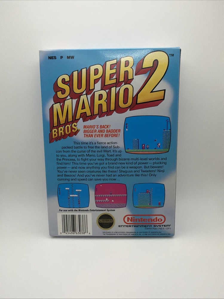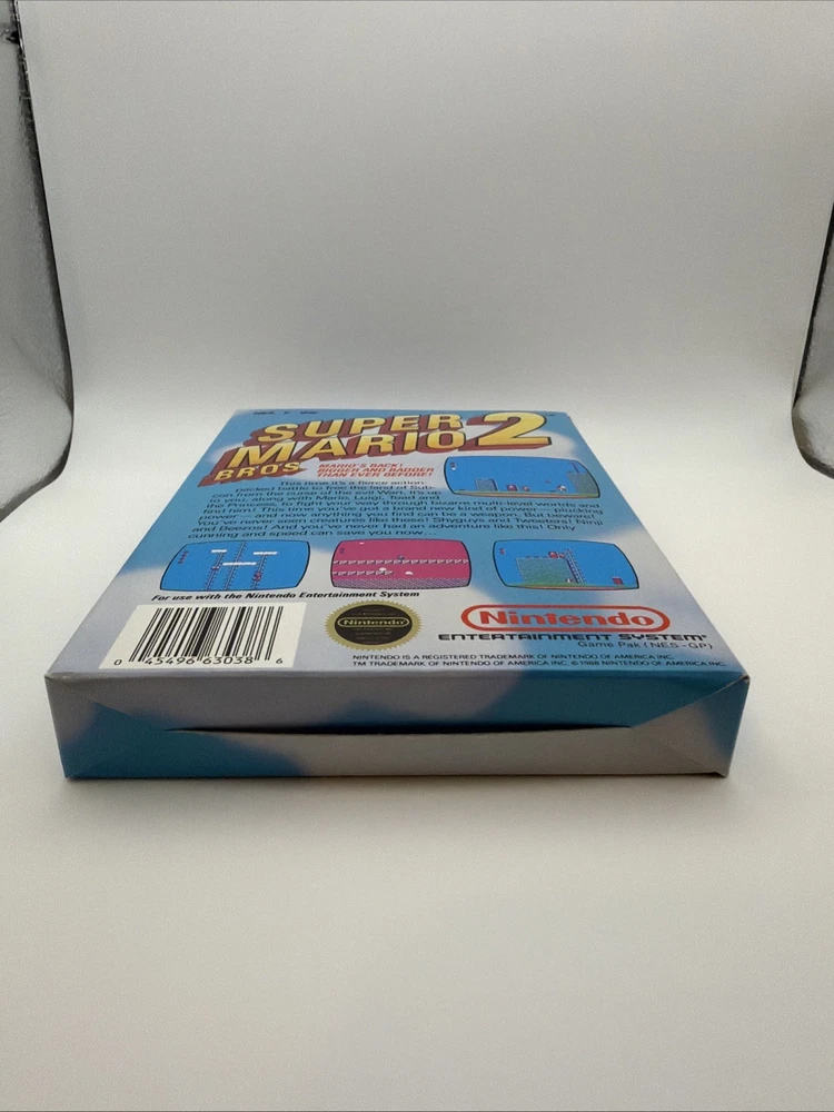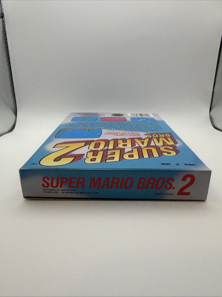The product is Super Mario Bros. 2 for the Nintendo NES console, released in 1988 by Nintendo. This platformer game features the iconic Mario character and offers exciting gameplay with a boxing sub-genre. The game comes complete in box (CIB) with the manual, making it a valuable addition to any retro gaming collection. With a NTSC-U/C (US/Canada) region code, this classic title is sure to provide hours of entertainment for fans of the Super Mario series and vintage video games in general. Item has scratch on top Left of box, please see picture