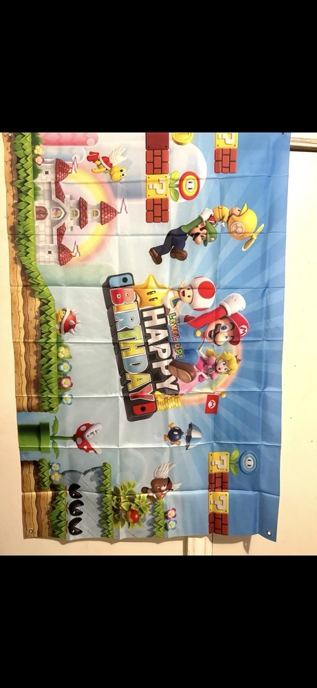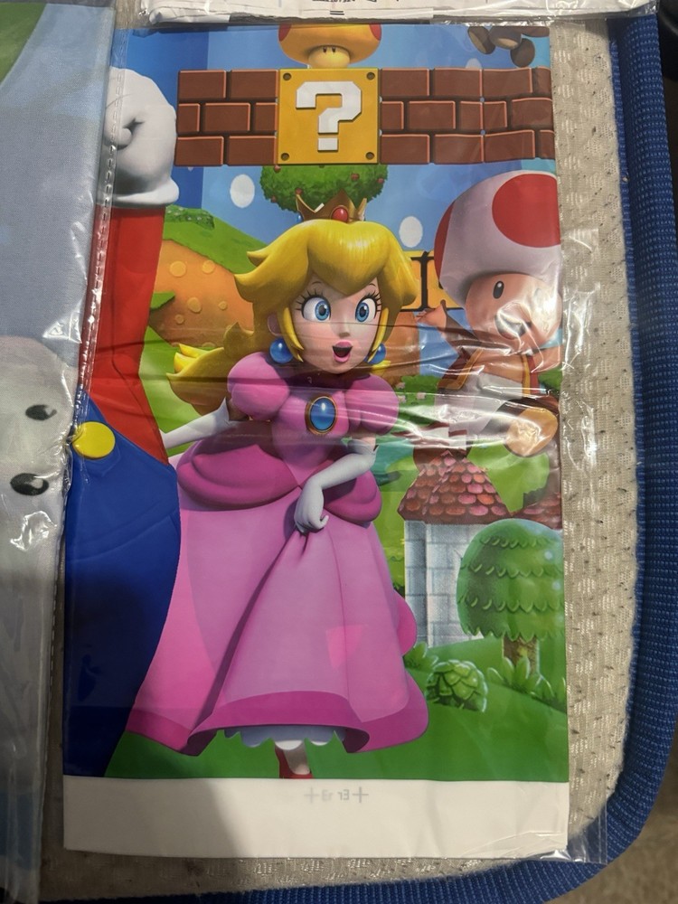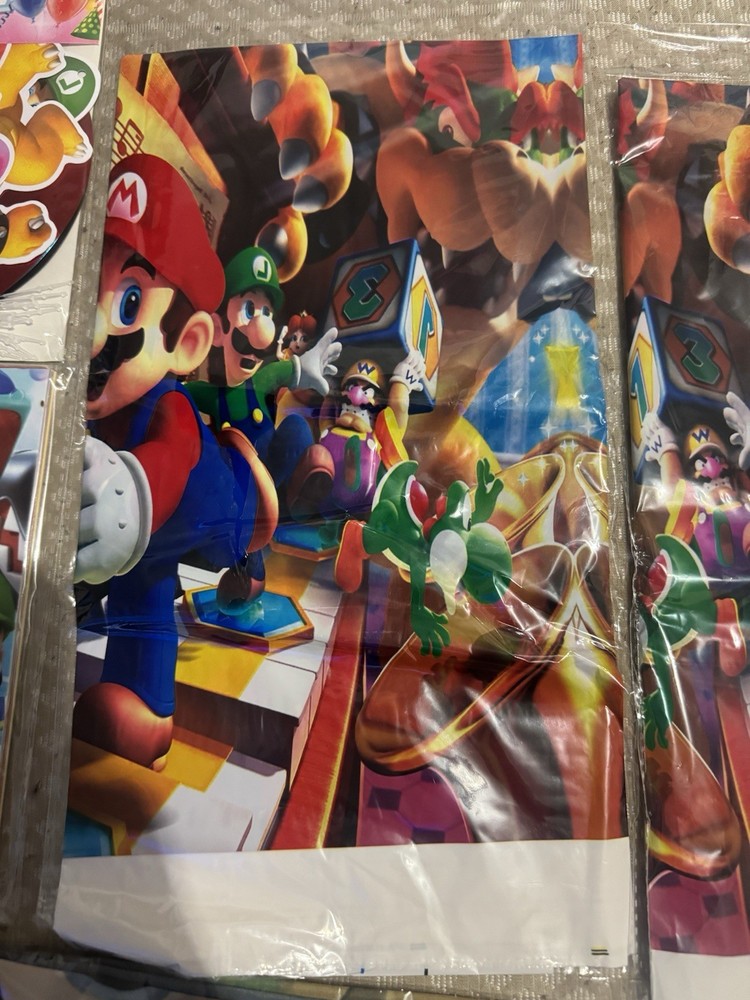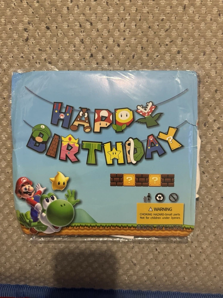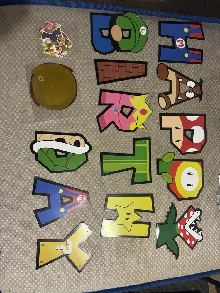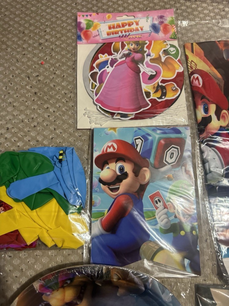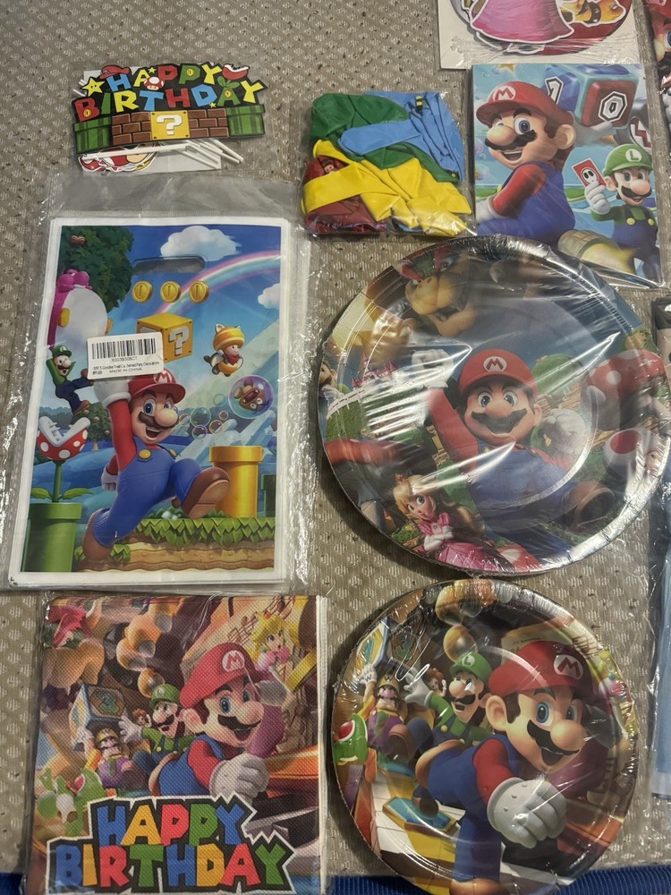 2 Happy Birthday signs 1 Mario signs to hand 2 Mario bros hanging signs 90 candy bags 1 Mario bros banner 3 table decors 1 table decor signs Ballon’s 1 pack of straws 1 pack of napkins 2 pack of plates 1 FREE candy bag toys (Last 2 pictures)