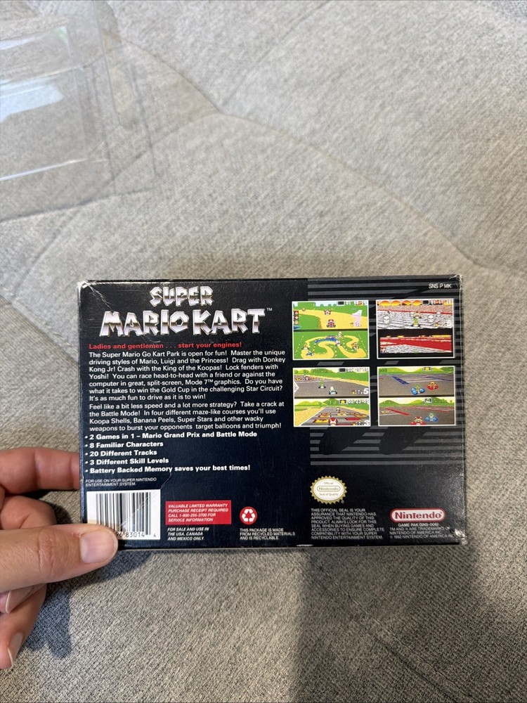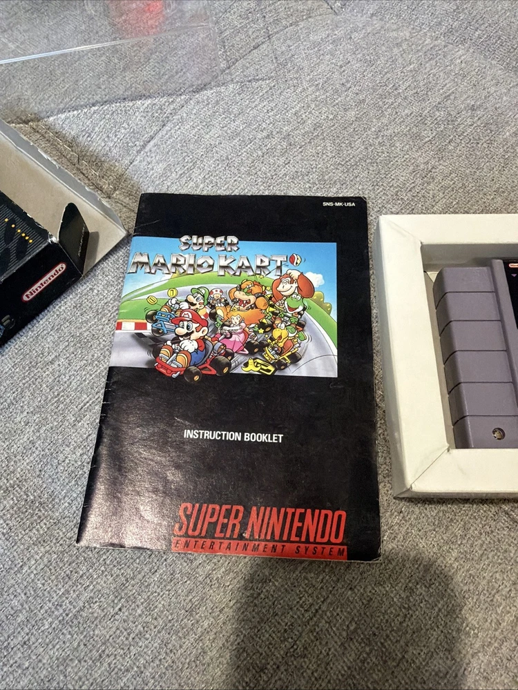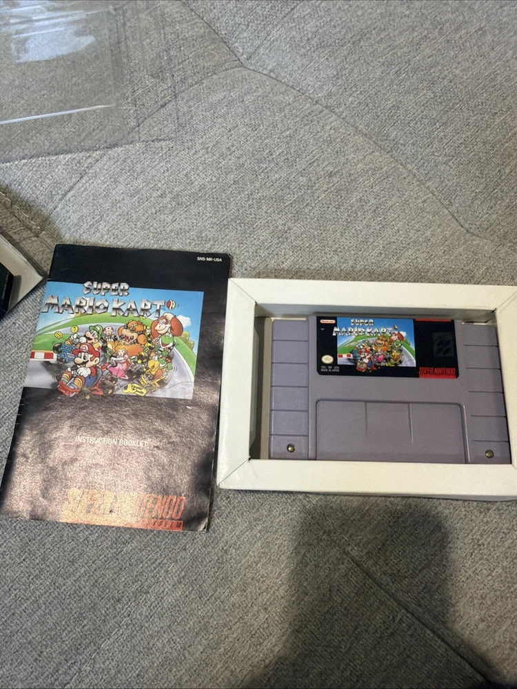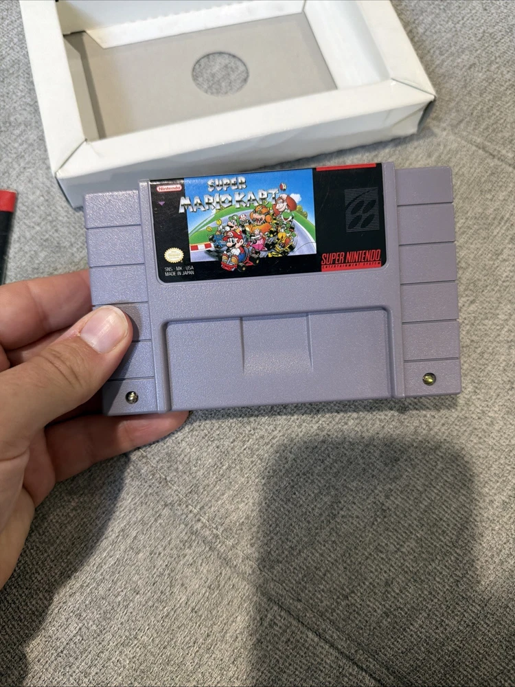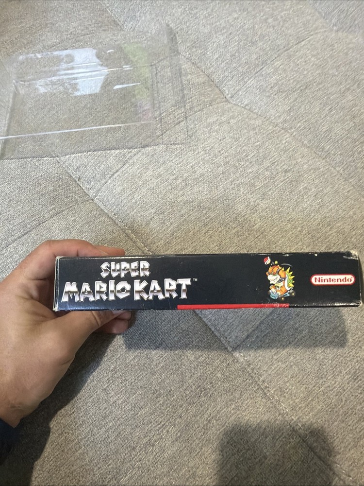 The product is a complete-in-box (CIB) Super Mario Kart game for the Super Nintendo SNES, released in 1992. This popular platformer game features the beloved Mario characters and offers exciting gameplay where players can enjoy racing and battling enemies in a fast-paced environment. With its classic gameplay and iconic characters, Super Mario Kart has become a beloved title in the world of video games.