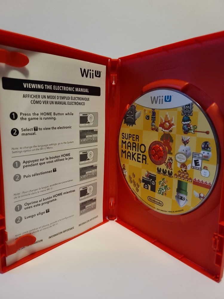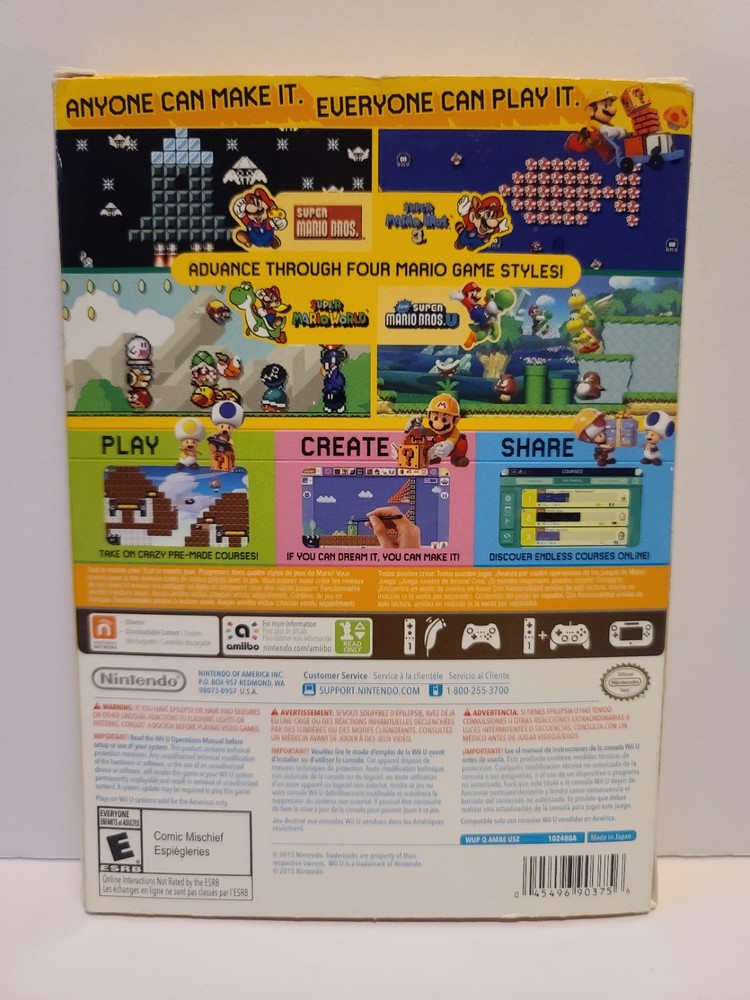 Country of Origin:United StatesRelease Year:2015Platform:Nintendo Wii UPublisher:Nintendo Gamesgtin13:0045496903756Features:Manual IncludedGame Name:Super Mario MakerRegion Code:NTSC-U/C (US/Canada)UPC:0045496903756Genre:PlatformerSub-Genre:BoxingRating:E-Everyone