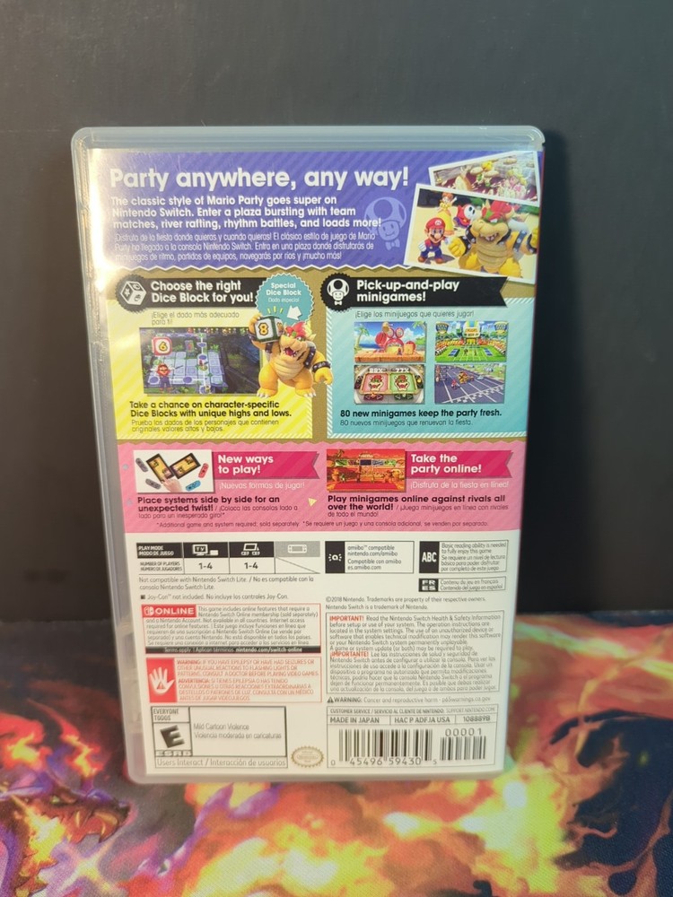 The product is Super Mario Party for the Nintendo Switch, published by Nintendo Games. It is a platformer-style video game with an E-Everyone rating. Players can enjoy the classic Mario gameplay on their Nintendo Switch console, competing in various mini-games and challenges in the colorful world of Mario. With fast shipping available, gamers can quickly dive into the fun and excitement of this beloved franchise. Works great, excellent condition