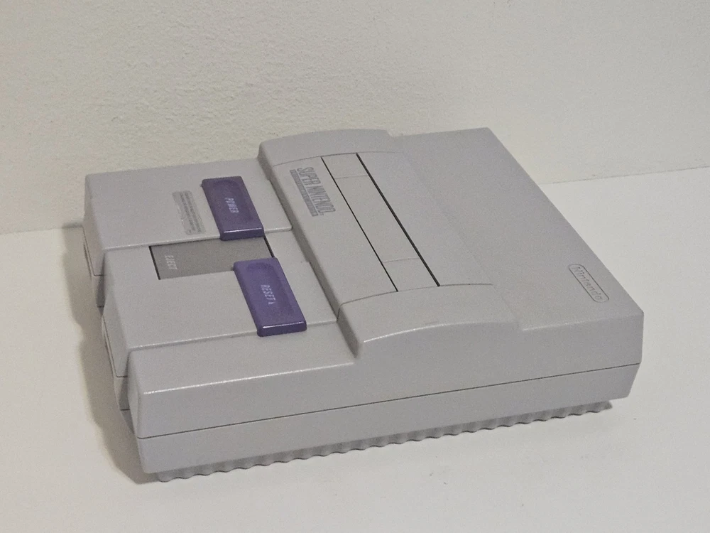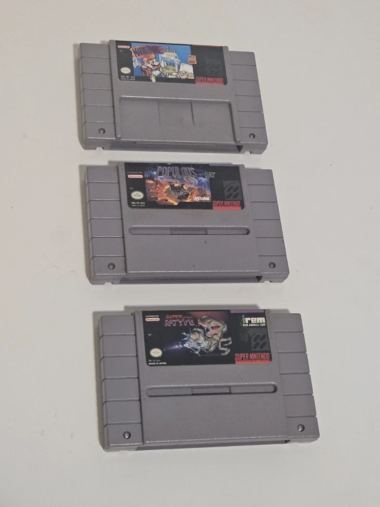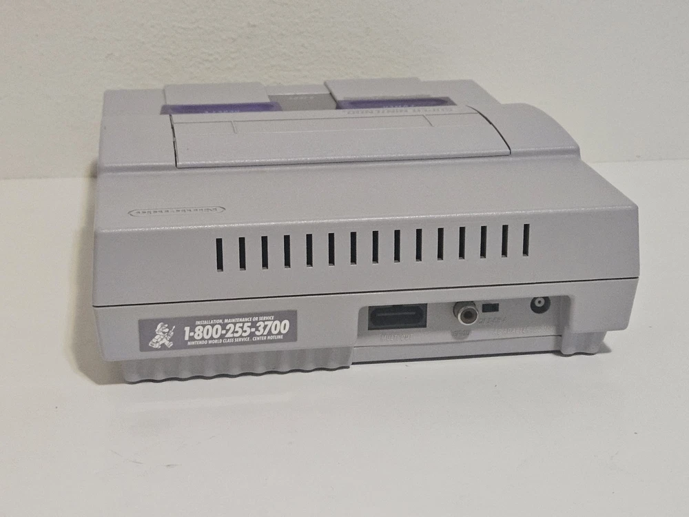 Super nintendo entertainment console bundle snes Model sns-001 control deck Comes with 3 games Mario paint Super R-type Populous 2 original super nintendo controllers models sns-005 Av audio video cable (matching purple) Multi connect power adapter Quality tested fully working Excellent condition (see photos for details)