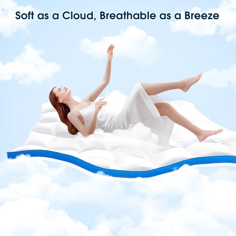 Ultimate Comfort : Our mattress topper is crafted from 100% cotton fibers, providing a soft and smooth touch that feels like baby skin. This material not only offers excellent skin-friendliness but also has breathability, ensuring you enjoy cooling and comfortable sleep experience in any season. Extra Thick Topper : Our extra thick super queen mattress topper (66"x80")is filled with the premium microfiber available, an advanced virgin fiber fabric padding that ensures maximum thickness. Our mattress pad is not only soft to the touch but also provides exceptional support, helping to alleviate back pain. Suitable for Various Scenarios : Our super queen mattress topper is a versatile addition to any bed, suitable for married couples with children or pets, cohabiting couples, small apartments, family homes, single-family houses, senior living facilities, and home bedrooms. Whether you’re a couple, a young family, a senior, or a renter, using the Mattress Pad can enhance sleep quality, protect your mattress, and adapt to various lifestyle needs. Easy Care & Durable : Our mattress pad uses high-density weaving techniques to ensure the padding is evenly distributed, preventing clumping or shifting even after extended use. Additionally, our mattresses toppers are easy to clean. Simply wash the mattress protector in cold water on a gentle cycle and tumble dry on low heat. Perfect Fit & Secure : Our pillow top mattress cover features elastic edges designed to fit various mattress thicknesses, from slim to thick, staying snugly in place throughout the night. This means it will stay securely wrapped around your memory foam mattress, providing continuous comfort and protection for a peaceful sleep.