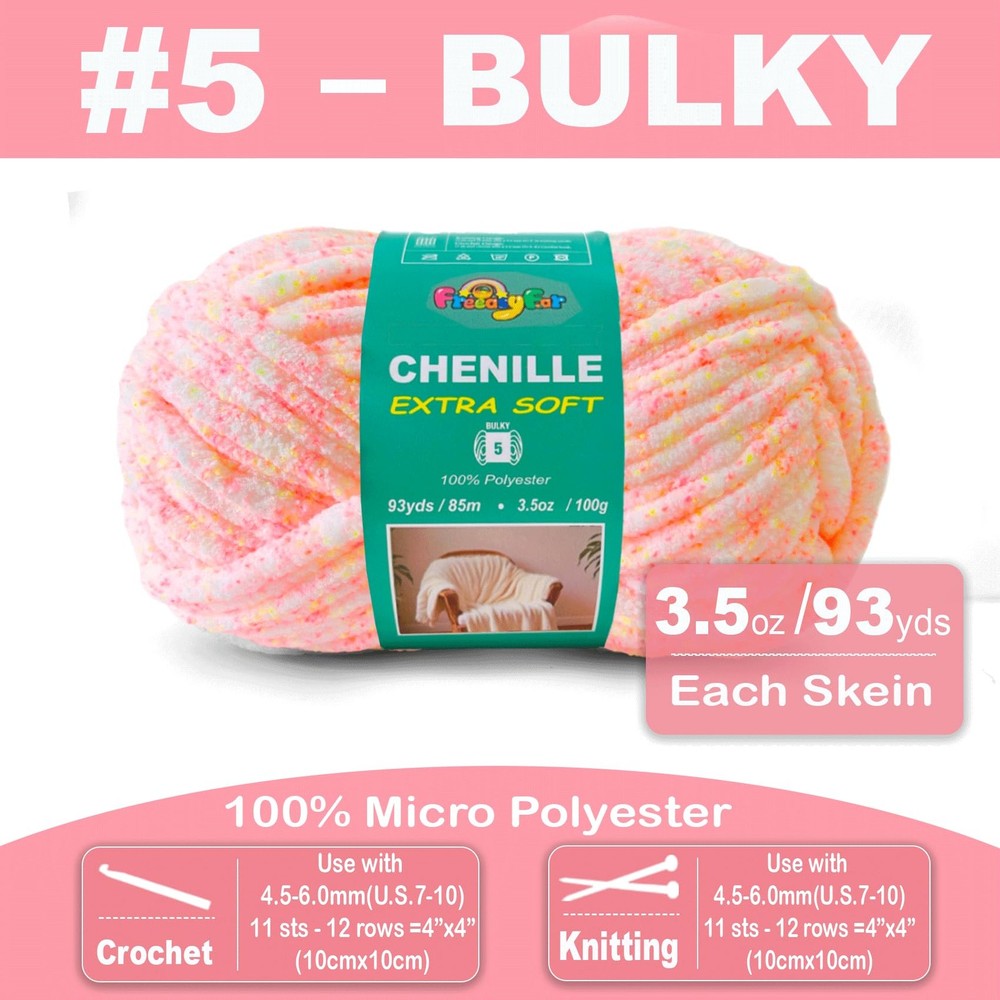Introducing Bulky #5 Chenille Yarn for Crocheting & Knitting Each skein is classified as Bulky #5, providing just the right thickness for your knitting and crocheting projects. It's soft, durable, and incredibly easy to work with. Whether you're a beginner or an experienced crafter, our yarn offers a smooth stitching experience without the frustration of yarn breakage or shedding. Ultra-Soft & Easy to Use Our chenille yarn is exceptionally soft to the touch, making it a pleasure to knit or crochet with. Designed for smooth handling, it’s sturdy enough to resist breakage and stays intact through all your creative endeavors, ensuring your projects remain flawless and tangle-free. Perfect for Various Crafting Projects From cozy blankets and cushions to scarves, hats, and more, this versatile yarn is perfect for all your DIY projects. Its durable, bulky nature makes it ideal for home décor, macramé, weaving, and other creative applications, no matter where your inspiration takes you. Designed for All Ages This yarn is a great choice for crafters of any age, whether you're a child, teen, adult, or senior. Its user-friendly nature allows for easy arm knitting, large hand-knitting projects, or intricate big stitch designs. The softness and thickness make it a favorite for bold, oversized creations. Unique Color Customization What truly sets our yarn apart is the ability to customize its colors. Our exclusive hand-dyed multicolor variations offer one-of-a-kind tones, with stunning ombre and variegated effects. You won’t find these distinctive color blends anywhere else, making your projects stand out with unparalleled style. Easy Care Instructions Machine washable and easy to care for: 1. Hand wash or machine wash on a gentle cycle with cold water (max 30°C/86°F). 2. Tumble dry on low heat or air dry flat. 3. Do not bleach, iron, or dry clean. 【Bulky #5 Chenille Yarn for Crocheting & Knitting】chenille yarn is made of 100% premium polyester. 3.5oz/93yard of each skein,it providing just the right thickness for your knitting and crocheting projects. It's soft, durable, and incredibly easy to work with. Whether you're a beginner or an experienced crafter, our yarn offers a smooth stitching experience without the frustration of yarn breakage or shedding. 【Ultra-Soft & Easy to Use】Unlike the traditional chenille and velvet yarn, This Ultra soft chenille yarn offers unmatched softness and durabiity for lasting projects,and also our chenille doesn’t shed or fall apart, It is easy to crochet with and glides easily through your fingers and hook. 【Unique Color Customization】What truly sets our yarn apart is the ability to customize its colors. Our exclusive multicolor variations offer one-of-a-kind tones, with stunning ombre and variegated effects. You won’t find these distinctive color blends anywhere else, making your projects stand out with unparalleled style. 【Perfect for Various Crafting Projects】The fluffy Chenille feels soft and warm against your skin and is great for making baby blankets along with an assortment of other projects like amigurumi,scarves, hats, and more, this versatile yarn is perfect for all your DIY projects. Its durable, bulky nature makes it ideal for home décor, macramé, weaving, and other creative applications. 【Crochet Gauge】The 4" x 4" crocheting gauge is 11 sc and 12 rows with a 5.0 mm (U.S.6) hook. if doing amigurumi, recommend to use a 4.5,mm hook; if doing blankets/hats/scarves etc need a 5.5-6.0mm hook. 【Knitting Gauge】Use with 4.5-6.0mm (US.7-10) Knitting Needle, the 4" x 4" knitting gauge is 12 sc and 13 rows with a 5.0 mm (U.S.8) needle. 【Easy Care Instructions】Machine washable and easy to care for: 1. Hand wash or machine wash on a gentle cycle with cold water (max 30°C/86°F). 2. Tumble dry on low heat or air dry flat. 3. Do not bleach, iron, or dry clean.