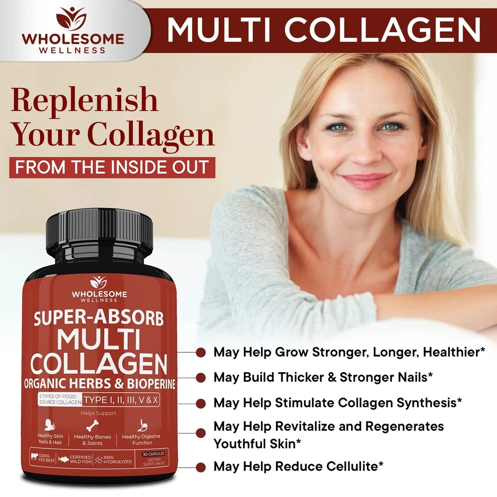 Super-Absorbable Multi Collagen with Ogranic Herbs Bioperine for Bio-Availability (90 , 2000MG per serving) is a complete source of important bone broth and collagen peptides type I, II, III, V and X. Our special formula with organic herbs and Bioperine helps maximize absorption and bio-availability for a stronger and quicker effect. Our advanced multi collagen offers a high quality blend of grass-fed bovine, chicken, certified wild fish, and egg membrane collagen.Organic Herbs & Bioperine for maximum absorption & bio-availabilityHydrolyzed Collagen Peptides from Grass-Fed BeefCollagen from Chicken Bone BrothHydrolyzed Collagen Peptides from Wild FishClinically Studied Eggshell MembraneProudly made in the USA in an approved GMP facility, 3rd party lab tested & certified. Try risk-free! Maximum Absorption & Bio-Availability - Organic Herbs and Bioperine help maximize absorption and bio-availability for a stronger and quicker effect from collagen. Super-Absorbable All-In-Super Collagen Blend - Your Collagen needs are covered with all 5 types of collagen hydrolysate, ultra premium bone broth, super absorbent collagen with a high-quality, potent, blend of 100% grass-fed beef, chicken, certified wild fish, and eggshell membrane collagen, providing collagen types I, II, III, V and X. Don’t settle for just Types 1 and 3 when you can have all 5 in easy-to-take collagen for men and women. Amazing Collagen Benefits From All 5 Types of Collagen. Values - Made in USA, GMP-Certified Manufacturing, 3rd Party Lab Tested for Purity & Potency, 100% Hydrolyzed, Grass-Fed Beef, Certified Wild Fish, Organic, Gluten-Free, Vital Ingredients, GMO-Free, Raw, Peanut-Free, Dairy-Free, Soy-Free, Herbicide-Free, Pesticide-Free, Paleo-approved. Easy and convenient to take compared to ancient collagen proteins peptide . As a small family business, we fully understand the uncertainty and risk of trying new products. This, together with our confidence that you will be happy with our best Multi Collagen , we offer you a Satisfaction , no questions asked.