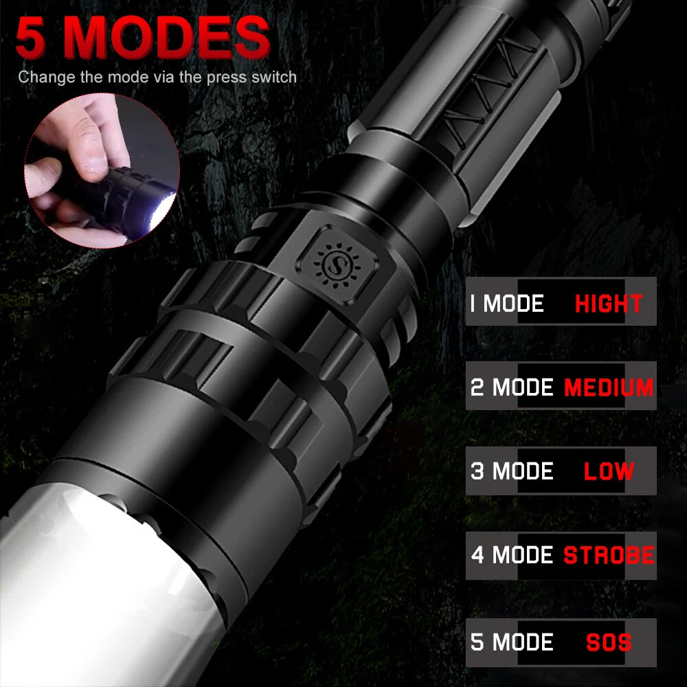 Product Description This powerful and practical medium-sized all-purpose flashlight is the perfect gift for a father or husband for any occasion. The robust, high-strength aluminum body is suitable for extreme conditions indoors and outdoors. You can count on it in the event of storms, floods, power cuts, earthquakes and other natural disasters. This portable and reliable flashlight can be conveniently stowed in your truck, camping gear or survival kit. The flash function is lifesaving when roadside repairs are made or help is asked for. It is extremely reliable and easy to use. It is the perfect flashlight for camping, hiking, hunting, exploring or even trying it out. FLASHLIGHT FEATURES: LED lamp - brighter and more efficient than a typical incandescent lamp Heavy and solid construction Low battery consumption enables hours of use Multiple functions: high, low, flash Weather, water and shockproof Tactical tail switch for one-hand operation Anti-roll and versatile Package includes 1 Flashlights, 1 Charging Cables On Jan 22, 2025 at 00:38:00 PST, seller added the following information: