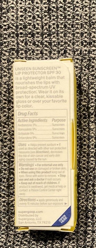 Supergoop!'s Unseen Lipscreen Sheer Lip Protector offers rigorous sun protection with a blend of active ingredients including Octocrylene, Homosalate, Octisalate, and Avobenzone, all while keeping your lips comfortably moisturized. This clear, solid stick lip balm is designed to shield your lips from harmful UV rays, with a Sun Protection Factor (SPF) of 30 and PA+++ UVA protection, ensuring peace of mind with every sunny day. Crafted for all skin types, this vegan and cruelty-free lip care provides hydration without the use of parabens, fragrances, or animal products. The luxurious formula contains beneficial ingredients like Octyldodecanol and Acai Fruit Oil, and is proudly manufactured in the United States. With its practical size of 0.12 oz, this Supergoop! product is an essential for anyone seeking to protect their lips from the elements. Brand new in packaging. Expiration date 05/2026.
