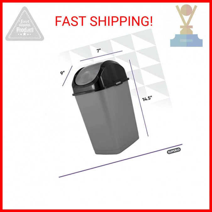 Superio Small 2.5 Gallon Plastic Trash Can with Swing Top Lid, Compact Slim Waste Bin for Under Desk, Office, Bedroom, Bathroom, Dorm Room, 10 Qt. Portable Garbage Can (Grey/Black) - Swing Top Lid- You don't have to work hard and open the cover of your trash can just use this easy swing lid which is practical and closes right away thus keeping all the trash out of sight. - Zero Chance of Rust - Unlike stainless steel trash cans, this durable and high-quality plastic garbage can, will never rust! - Comes in 6 Colors - We have a color to suit every preference! No matter the decor style, one of these trash can color, will work in your space. - Simple and Easy to Clean - Trash cans can get dirty quickly, which is why we offer a trash can that allows you to get into nooks and crannies without breaking a sweat! - Dimensions- This can is 2.5 gallons and 14.5 x 7 x 9 inches and fits into tight spaces. The Fine Print Payments We accept the following payment methods Visa/Mastercard PayPal Apple Pay Google Pay Please pay as soon as possible after winning an auction, this will allow for quicker shipping times! Returns We accept returns . You can return unopened items in the original packaging within 30 days of your purchase with receipt or proof of purchase . If 30 days or more have passed since your purchase , we cannot offer you a refund or an exchange . Upon receipt of the returned item , we will fully examine it and notify you via email , within a reasonable period of time , whether you are entitled to a return . If you are entitled to a return , we will refund your purchase price, and a credit will automatically be applied to your original method of payment . Only regular priced items may be refunded . Sale items are non -refundable . Buyer is responsible for return shipping costs + a 20% restocking fee. Shipping Shipment processing time All orders are processed within 2-3 business days. Orders are not shipped or delivered on weekends or holidays. If we are experiencing a high volume of orders, shipments may be delayed by a few days. Please allow additional days in transit for delivery. If there will be a significant delay in shipment of your order, we will contact you via email or telephone. Shipping rates & delivery estimates Shipping charges for your order will be calculated and displayed at checkout.