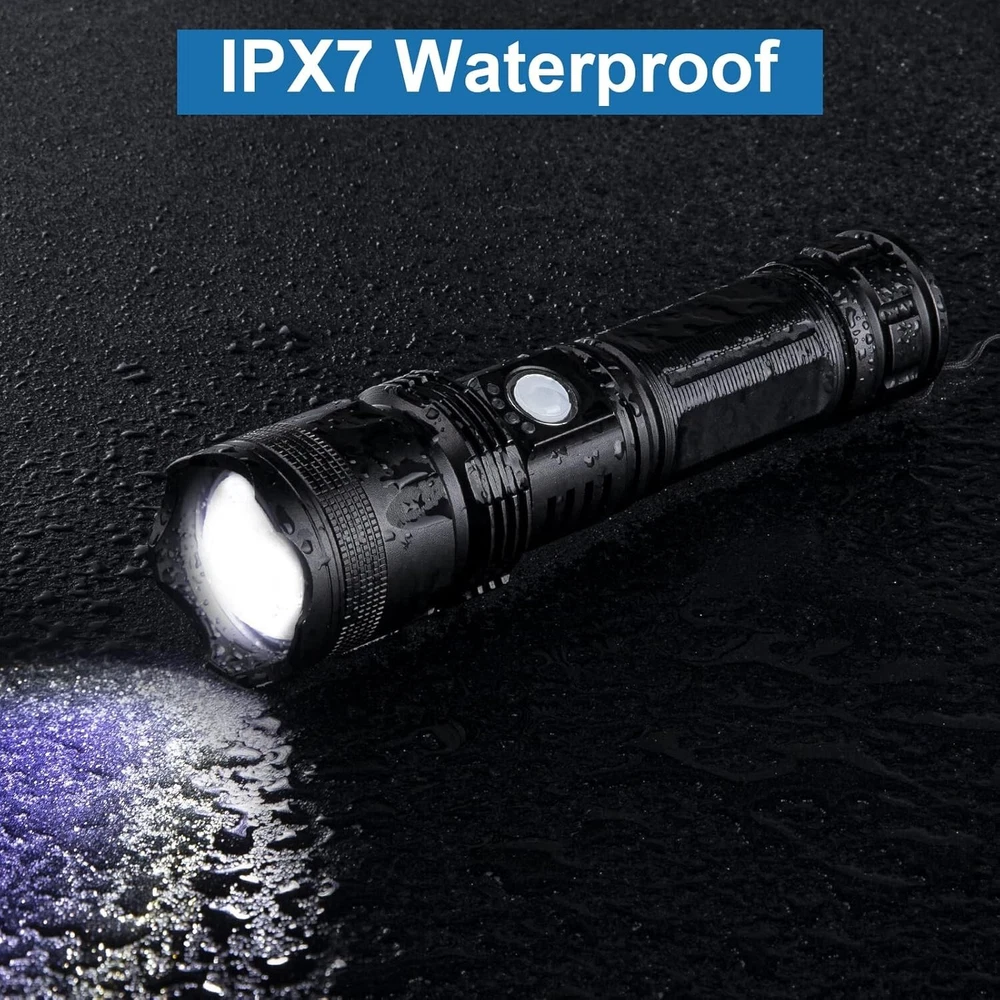 Lumens: 990000 Brand: Unbranded Voltage: 5 volts Battery Technology: Lithium Polymer Included Components: Charging Cable UPC: Does Not Apply Item Weight: 500 grams Power Source: Battery gtin13: Does Not Apply Personalize: No Color: Black Operating Time: 12 Hours Operating Range: 1000 m Brightness: 990000 Lumen Specification Met: Ce Number of Batteries: 2 Features: Rechargeable, Batteries Included, Waterproof, With Wrist Strap, Adjustable, Super Bright, 5 Light Modes Item Package Quantity: 2 Finish Type: Aluminium Alloy White Brightness: 100000 Lumens Finish Types: Aluminium Alloy Battery Description: Led Lighting Technology: LED Number of Lights: 1-3 Item Height: Rechargeable Flashlights Type: Flashlight Number of LEDs: 1 Batteries: 2 Lithium Polymer Batteries Required. (included) Water Resistance Level: Waterproof IP Rating: IPX7 Material: Aluminum, Polymer Battery Cell Composition: Polymer Light Path Distance: 1000 Meters Runtime: 12 Hours Style: Fashion Shade Material: Aluminum Light Source Type: Led Product Dimensions: 1.69"d X 1.69"w X 7.09"h Item Length: Rechargeable Flashlights