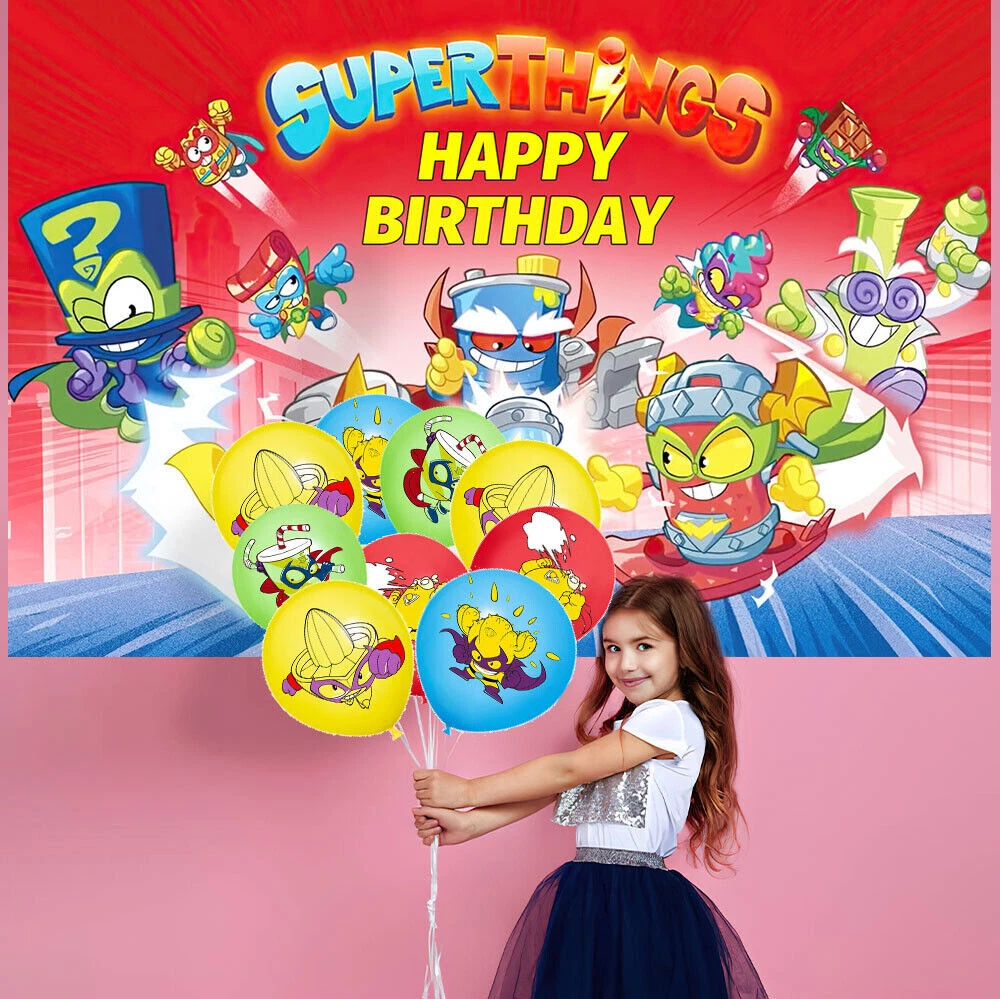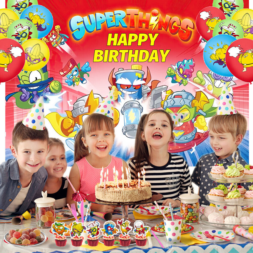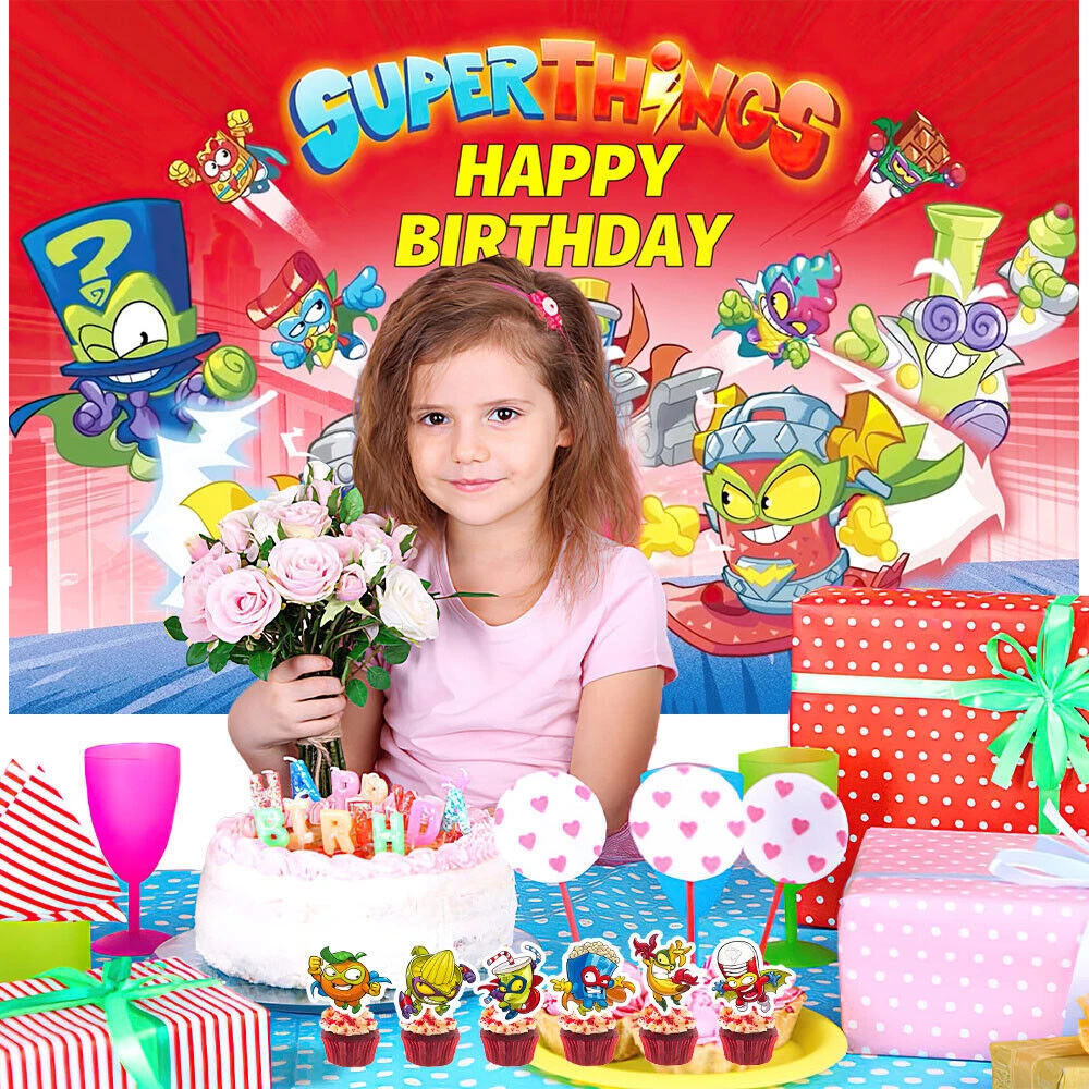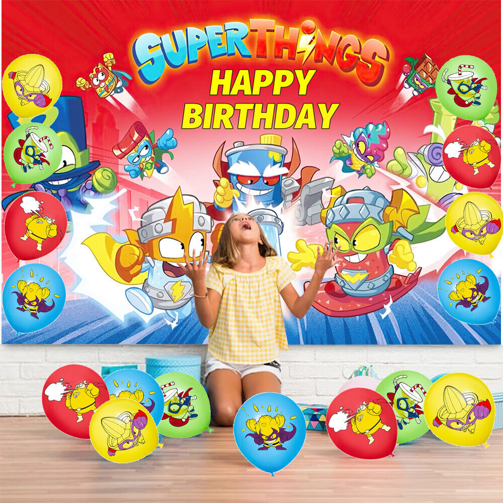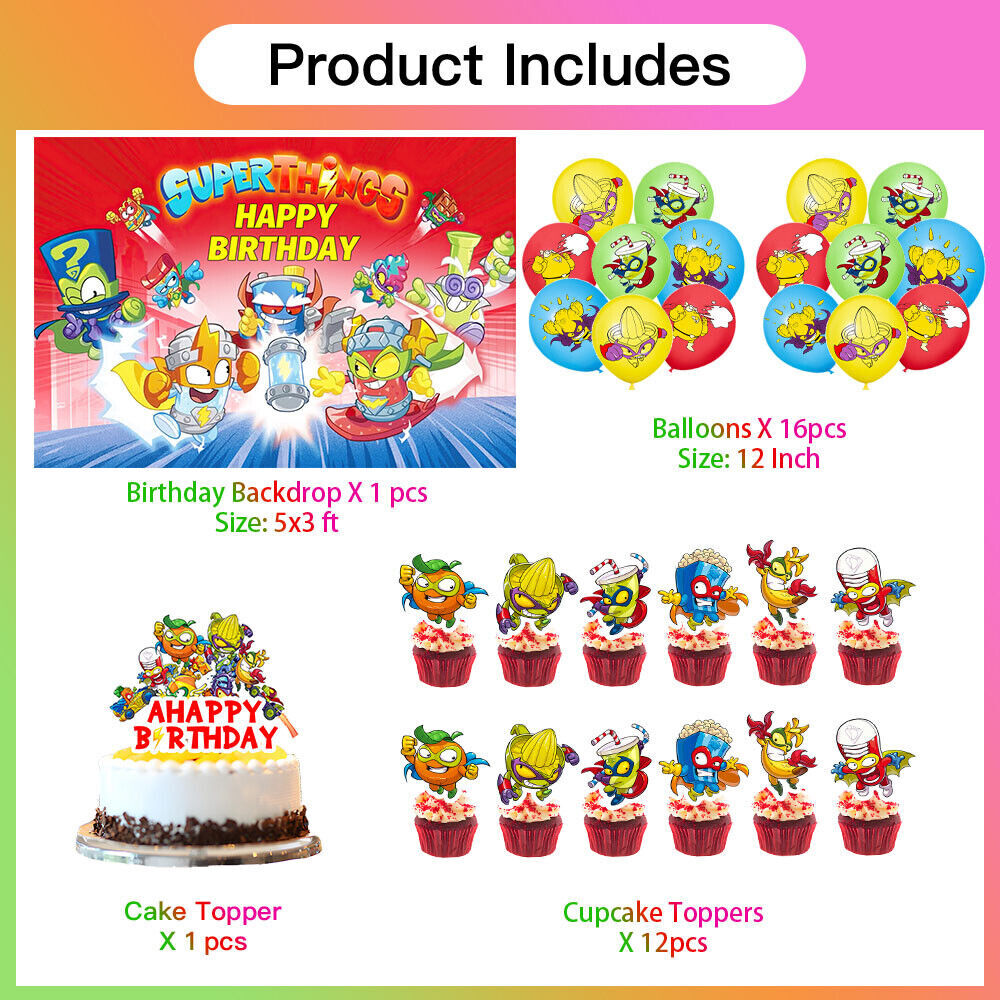 About this item 【Themed Sets of Matching Units】: ☰ Take this good favor for themed party to impress your kids and their friends. ☰ Enrich your kids’childhood dream well,giving them a fantastic surprise. 【Party Decor Is So Easy】: ☰ It contains all of your Superthings theme birthday party tableware needs and is completely disposable. ☰ You can save more time to enjoy this party with your guests. 【Real Savings For You】 ☰ The shiny large backdrop decor will attract you eyes and make everyone laugh.The banner cloth is printed in high definition, making it the perfect party background wall. It is made of thick cloth, not paper. ☰ You will save over 70% compared to buying 2 Superthings party supplies separately. 【Super Value Superthings Package】: ✪ 1PCS X Large Banner 5x3ft(150x100cm) ✪ 16PCS Balloons. ✪ 1PCS X Cake Topper. ✪ 12PCS X Cupcake Toppers. 【After Sale Service】: ☰ We try our best to bring the best use experience to our customers. ☰ If you are not satisfied with the purchase of this set or have any questions about the product,please contact us at any time.We will definitely solve the problem for you in the first time. ☰ We can aslo custom backdrop other size or pictures you want. Any questions please contact us.