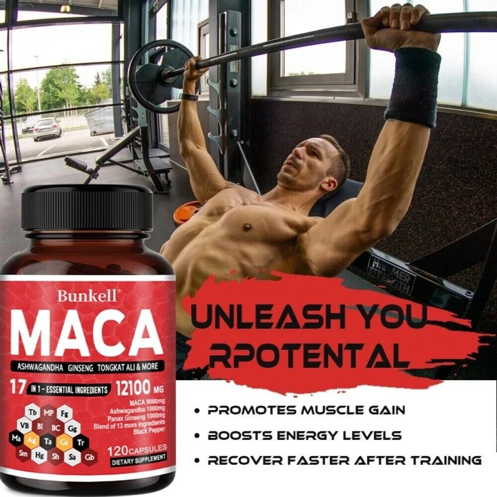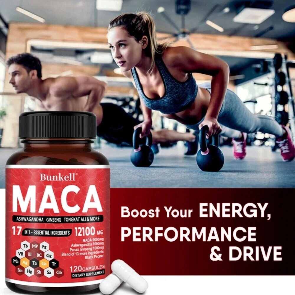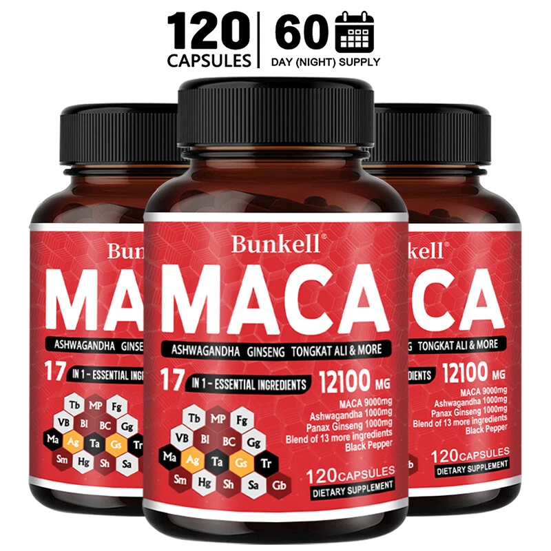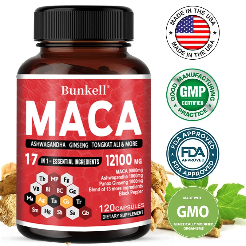 Description: Maca Root Supplement with Maca Root, Ashwagandha Root, Ginseng, Tribulus Terrestris, Shilajit and Black Pepper; improves well-being. 17-in-1 extract formula supports strength, muscle mass, energy production and immune system in men and women. All Bunkell supplements are made by cGMP, ISO and FDA registered manufacturers. Gluten-free, non-GMO, plant-based, keto-friendly, and vegan. American laboratory quality assurance. Maca-Ashwagandha herbal capsule blend supports balance through exercise and a healthy lifestyle. Learn about the benefits of Bunkell dietary supplements for safe and healthy living.