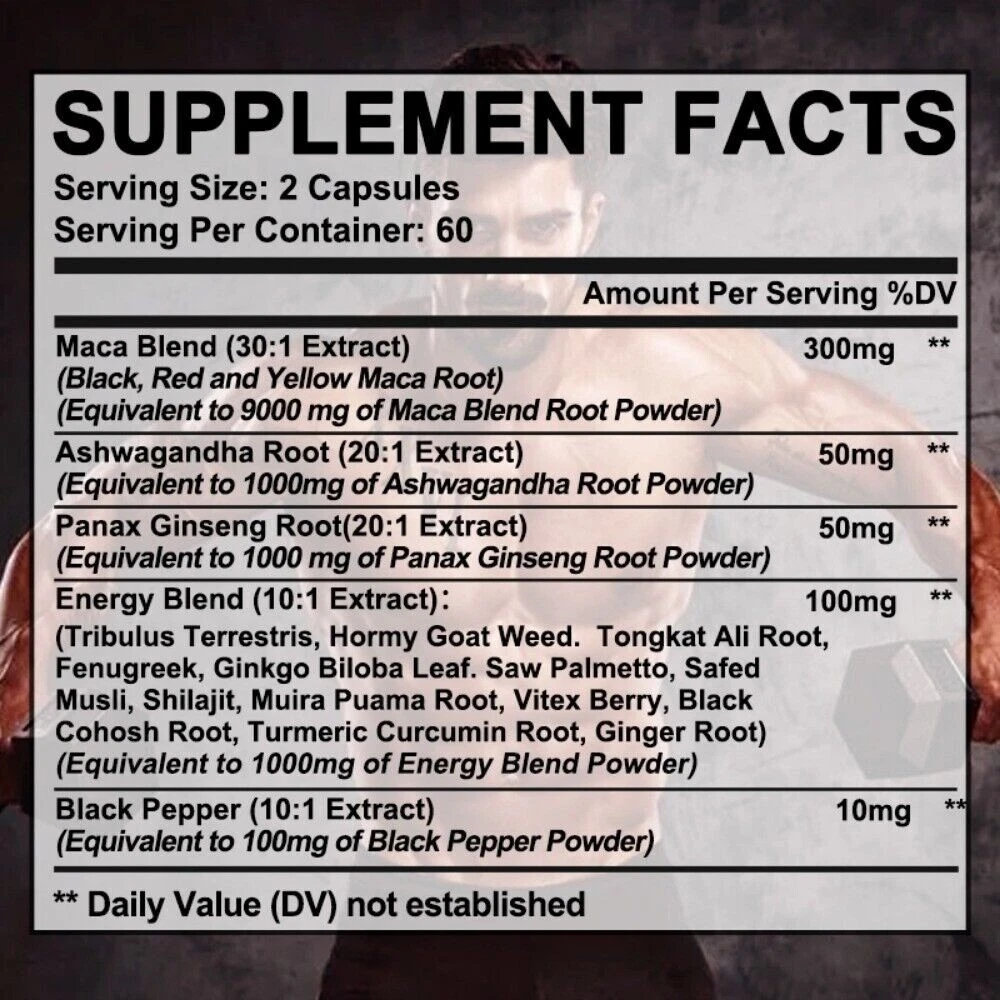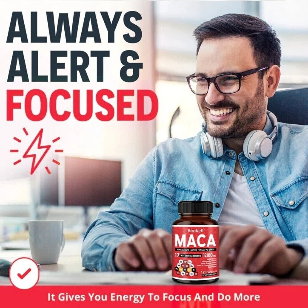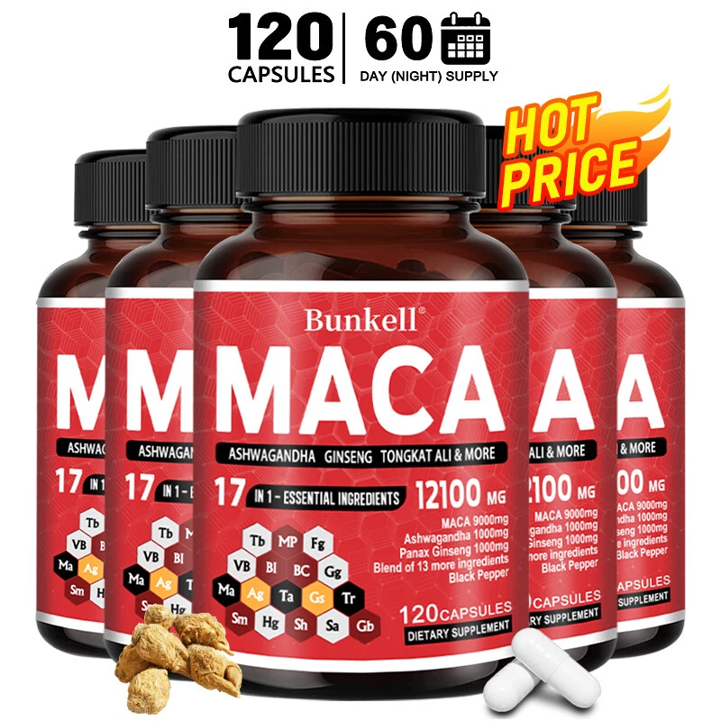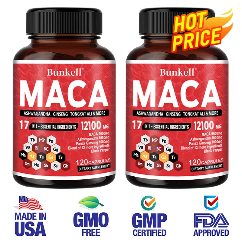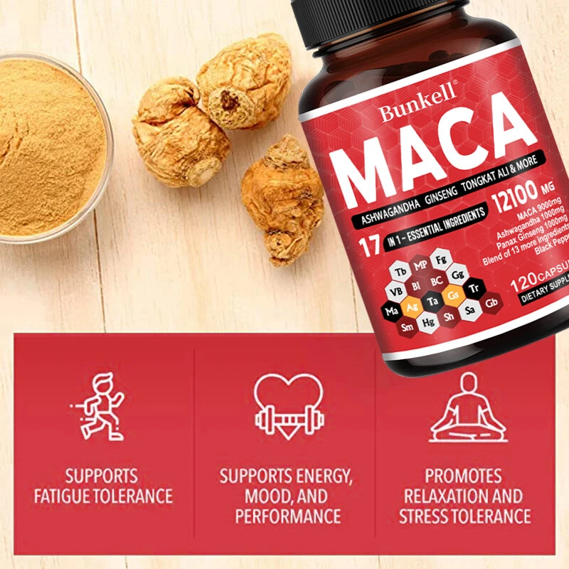 Description: Maca Root Supplement with Maca Root, Ashwagandha Root, Ginseng, Tribulus Terrestris, Shilajit and Black Pepper; improves well-being. 17-in-1 extract formula supports strength, muscle mass, energy production and immune system in men and women. All Bunkell supplements are made by cGMP, ISO and FDA registered manufacturers. Gluten-free, non-GMO, plant-based, keto-friendly, and vegan. American laboratory quality assurance. Maca-Ashwagandha herbal capsule blend supports balance through exercise and a healthy lifestyle. Learn about the benefits of Bunkell dietary supplements for safe and healthy living.