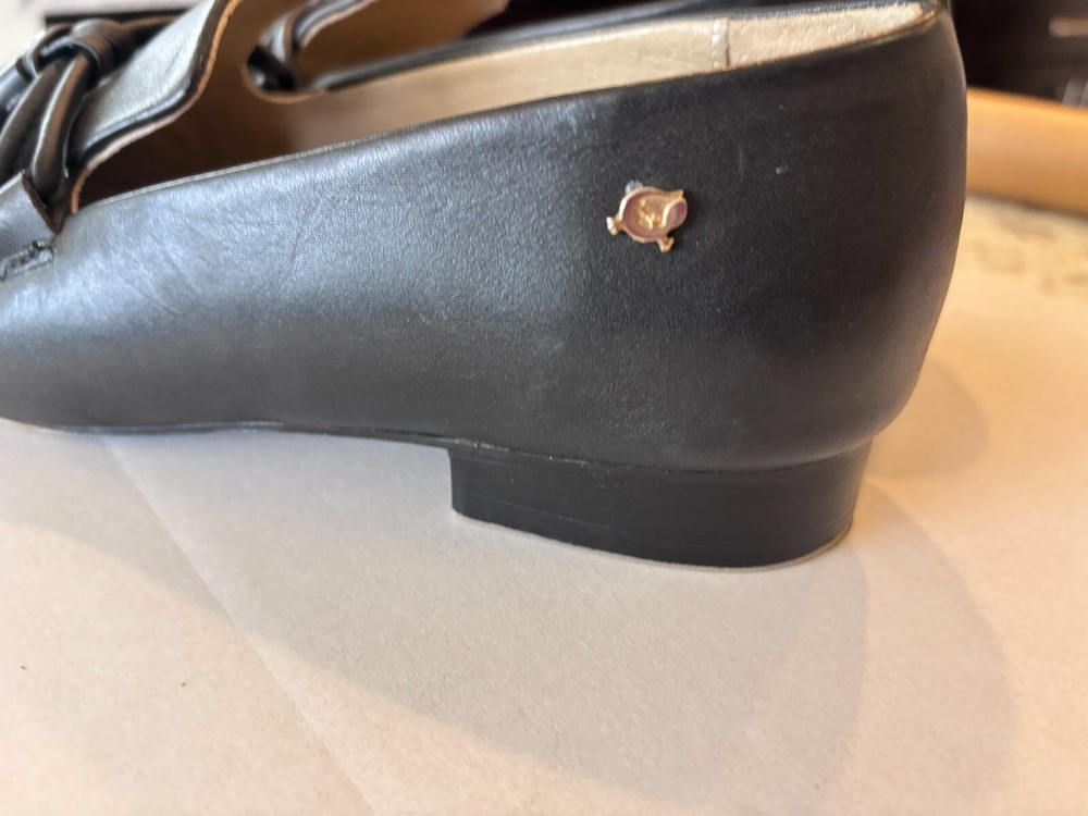 Type: Heel Pattern: Solid Customized: No Style: Loafers Outsole Material: Leather Shoe Width: M Department: Women Toe Shape: Round Toe Heel Height: Low (1-1.9 in) Insole Material: Leather Closure: Slip On Features: Lined US Shoe Size: 8 Upper Material: Leather, Suede Brand: Salamander Heel Style: Wedge Vintage: Yes Color: Black Lining Material: Leather