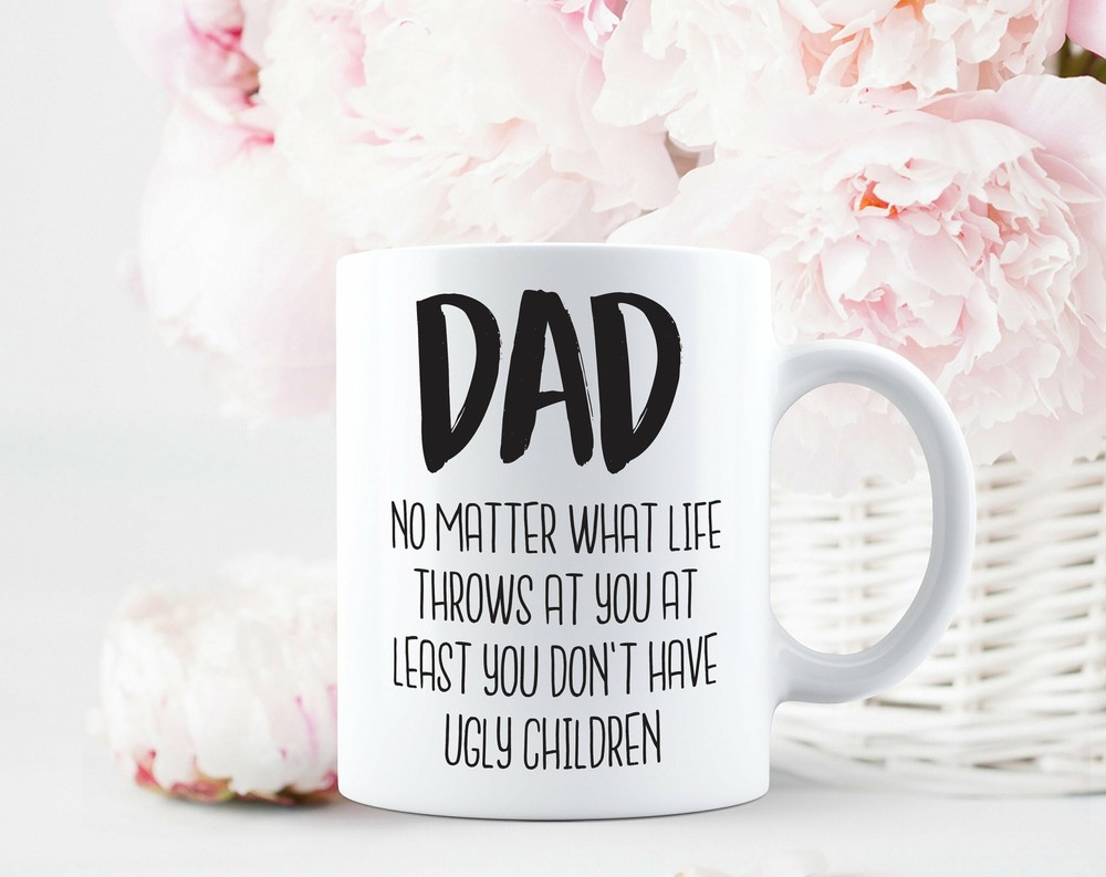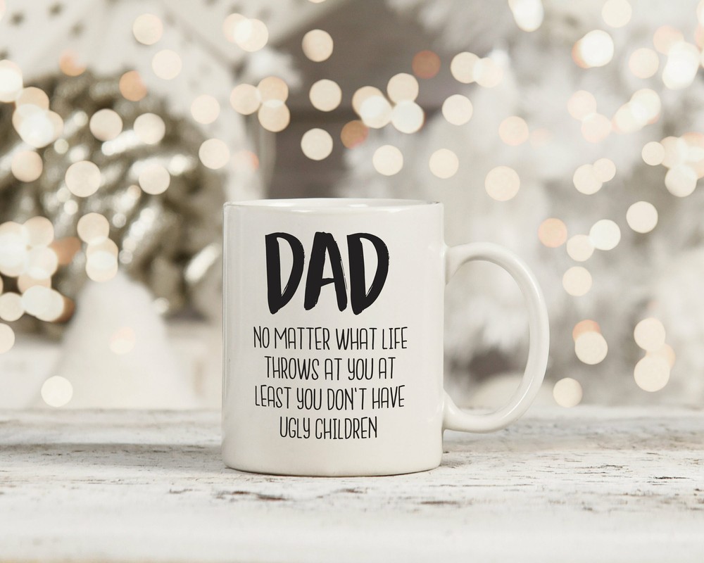 Dad No Matter What Life Throws At You At Least You Don't Have Ugly Children Product Details.. This high quality 11oz. ceramic white mug has a premium hard coat that provides crisp and vibrant color reproduction sure to last for years. Perfect for all hot & cold beverages. The highest quality printing possible is used. It will never fade no matter how many times you wash it. Material: 100% Ceramic. Print both sides. Dishwasher and Microwave Safe. High Gloss + Premium White Finish. Printed in the U.S.A. Personalized & Custom. We support personalized and custom mug to add custom, when placing an order, you can add notes to the "order note" in shipping address section. Also you can contact us directly via message. Shipping Info. Ready to ship in 1 to 2 business days, All products are made-to-order and proudly printed in the United States. Shipped by USPS and DHL, You will receive your order in 5-7 days. Replace & Refund. All products are defective during shipping broken, chipped will be replaced free of charge. You are not satisfied with the product, we will refund 100% money to you. If any other issues arise, please do not hesitate to message, we would be more than happy to assist you.