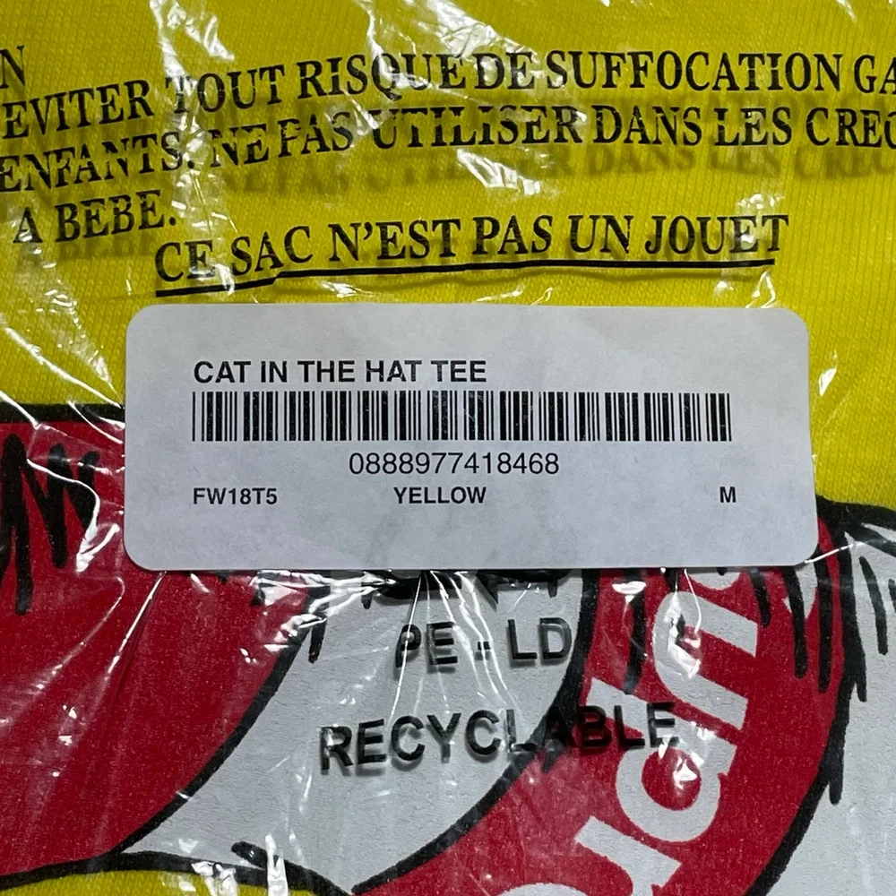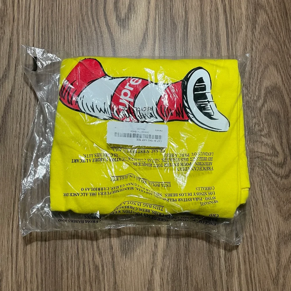 This Supreme Cat in the Hat Tee in yellow is the perfect addition to any streetwear fan's collection. Made for men in a regular fit size M, this t-shirt features a playful cat graphic that adds a touch of fun to any outfit. The shirt is made of high-quality materials, ensuring both comfort and durability. The iconic Supreme brand is known for its unique designs and limited-edition releases, making this t-shirt a must-have for collectors and fashion enthusiasts alike. The yellow color is eye-catching and on-trend, while the Cat in the Hat theme adds a playful touch. Add this shirt to your wardrobe today and make a statement with your style.