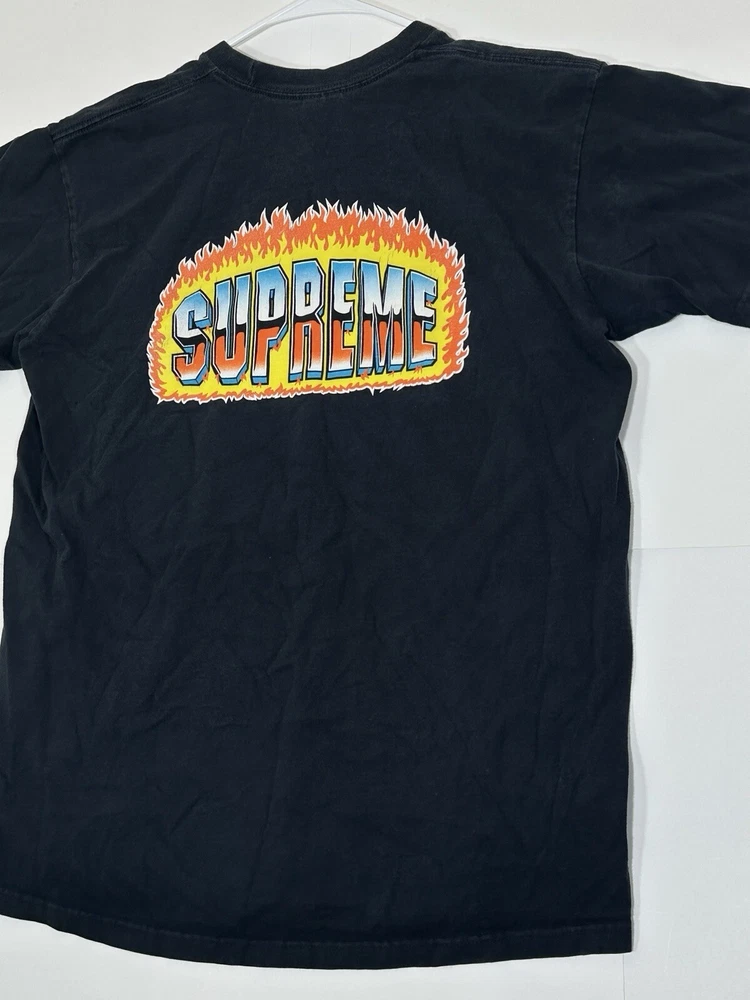 Supreme Chrome Fire Solid T-Shirt Black Men's Size Medium Skate Skateboarding USA Decent - to - pretty good condition overall - see ALL photos very closely Shirt has some discoloration/fade - light mild - to - moderate wear/tear overall throughout tee - some light marks throughout if anything - see ALL photos very closely for condition of tee Will ship with care